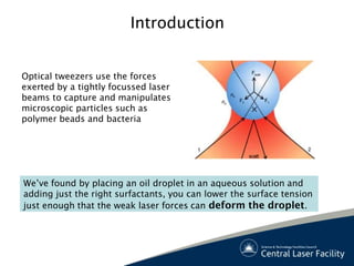Optical tweezers can be used to sculpt microscopic oil or monomer droplets by lowering their surface tension with surfactants. Multiple laser traps can deform a single droplet into various 3D shapes and connect multiple droplets with nano-scale threads. This technique could potentially solidify shapes through polymerization and create nanofluidic networks for chemical synthesis.