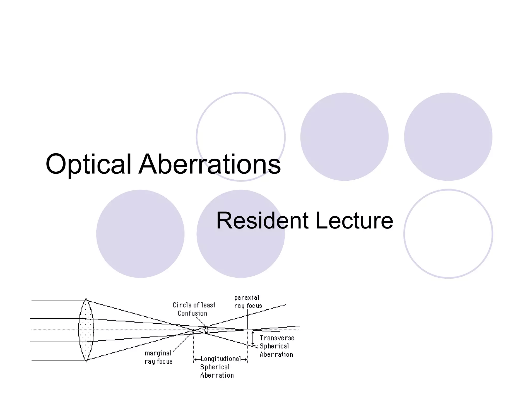 This document discusses various optical aberrations including chromatic aberration, spherical aberration, oblique astigmatism, coma, curvature of field, and distortion. It provides explanations of each aberration, examples of their effects, and methods of correction, such as using achromatic doublets, aspheric surfaces, and customized lenses. The human eye has developed techniques to reduce aberrations through features like a curved retina and changes in the lens index from the nucleus outward. Advances now allow measuring and correcting higher order aberrations.