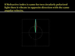 This document discusses optical rotatory dispersion (ORD), which is defined as the rate of change of specific rotation with a change in wavelength. ORD is used to determine the structures of carbonyl compounds. Key points covered include: the principles of plane polarized light, optical activity, specific rotation, and circular birefringence; factors that affect specific rotation; Cotton effects and curves; and the octant rule for establishing absolute configuration from ORD data.