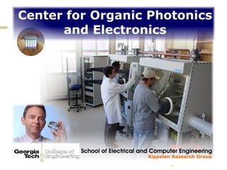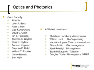The document describes the Optics and Photonics program at Georgia Tech. It lists the core faculty and their primary research areas, which include optical communication networks, nonlinear optics, photonics and optoelectronics, and diffractive and holographic optics. It also describes affiliated research centers that conduct research in related areas such as quantum optics, terahertz science, ultrafast nano-optics, and organic electronics.
