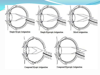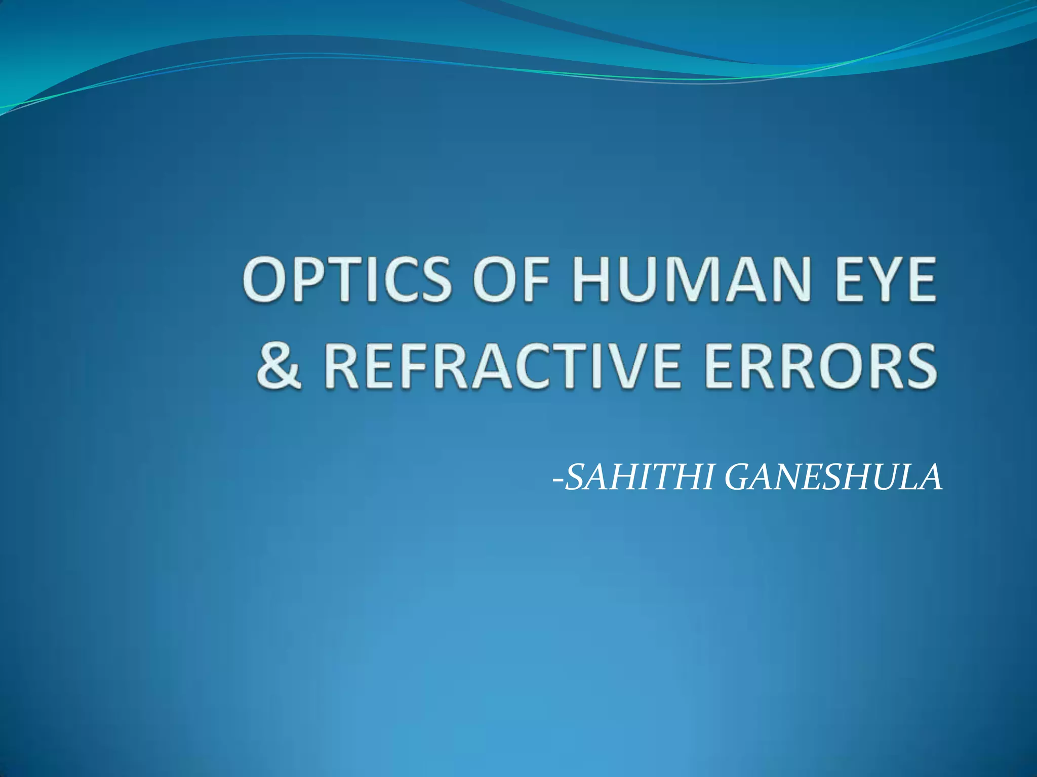 The document discusses the anatomy and optics of the human eye. It describes the main components of the eye, including the cornea, iris, lens, retina, and their functions. It also covers topics like emmetropia, refractive errors including myopia and hyperopia, their causes and treatments. Schematic and reduced eye models are introduced to conceptualize the optical properties of the eye.