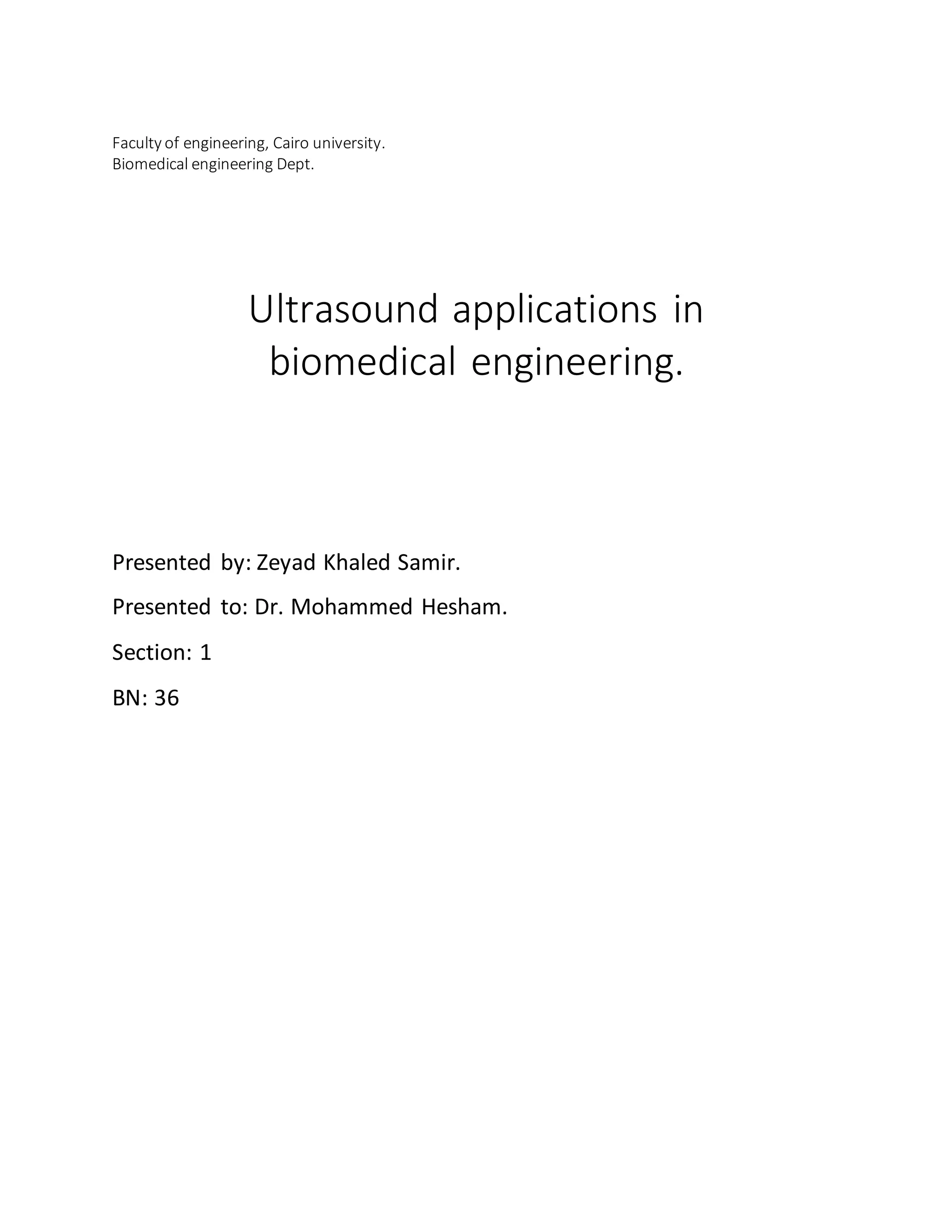 Ultrasound has many applications in biomedical engineering and medicine. It uses sound waves with frequencies above human hearing to produce images of internal organs and structures. Some key uses of ultrasound in medicine include diagnostic imaging of tissues and organs, obstetric sonography to monitor fetuses, and its increasing use in trauma/first aid situations. Ultrasound provides real-time images at low cost and with no known health risks compared to techniques using ionizing radiation like CT or MRI.