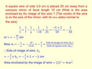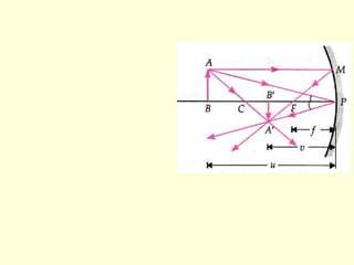 The document discusses the principles of ray optics, focusing on reflection and the behavior of light with plane and curved mirrors. It explains key concepts such as the laws of reflection, real versus virtual images, and the characteristics of different types of mirrors, including concave and convex mirrors. It also includes practical applications and mathematical relationships related to the formation of images and their magnification in various mirror types.
