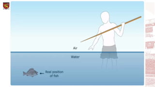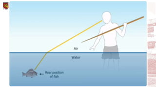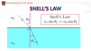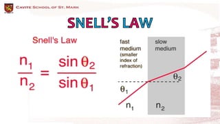 The document discusses the properties of light including reflection, refraction, dispersion, diffraction, interference, and polarization. It provides examples of how light bends, or refracts, when moving between transparent materials with different refractive indices, causing the light to change speed. Sample problems are shown calculating angles of incidence and refraction using Snell's law and the refractive indices of materials like glass, water, and optical fibers.