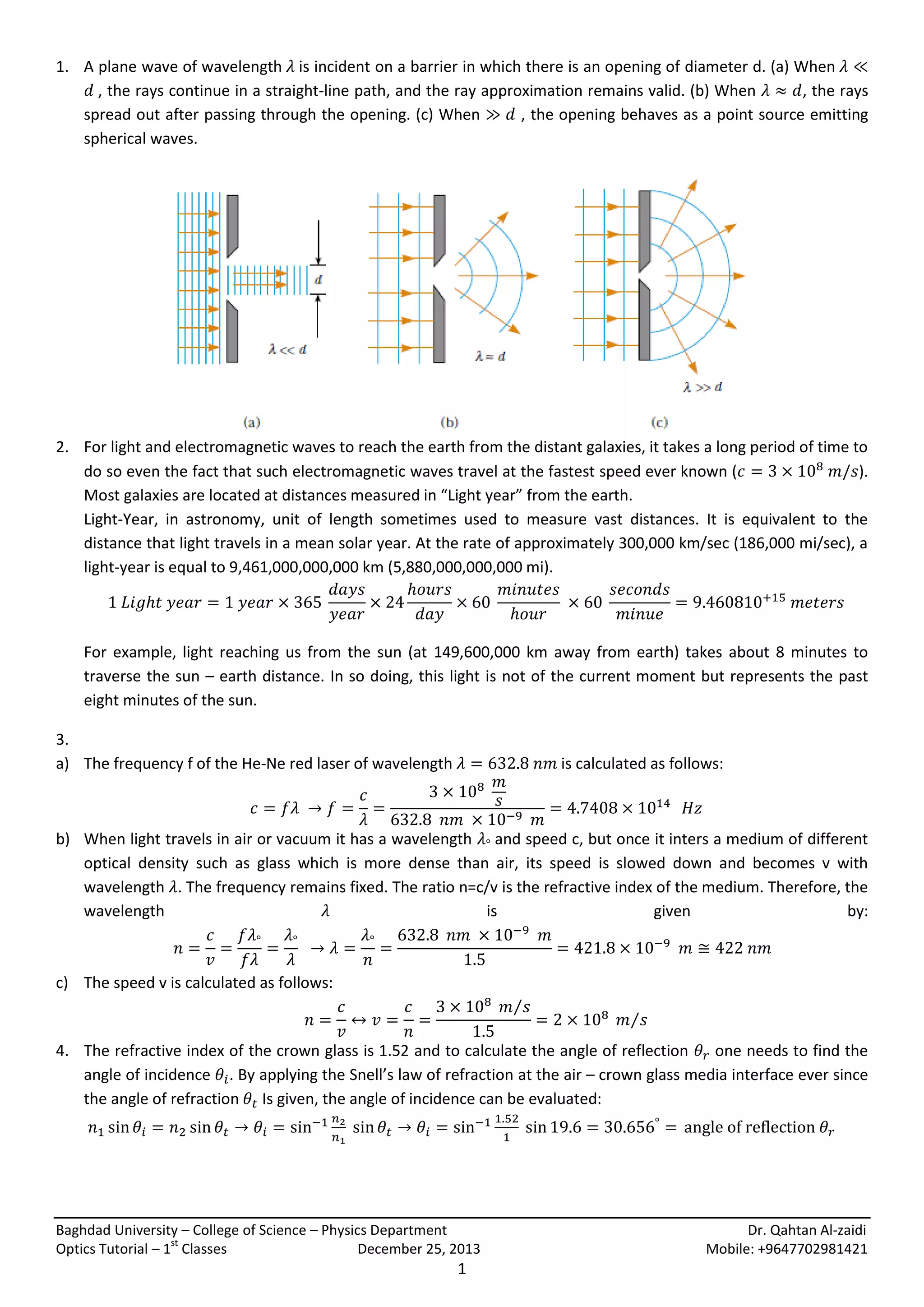 1. This document discusses several optics concepts including: the behavior of light passing through openings of different diameters, how light travels from distant galaxies, calculating the speed and wavelength of light in different media using Snell's law and the refractive index, calculating angles of reflection and refraction, types of waves, and more. Maxwell's equations predict electromagnetic waves that propagate through space at the speed of light.