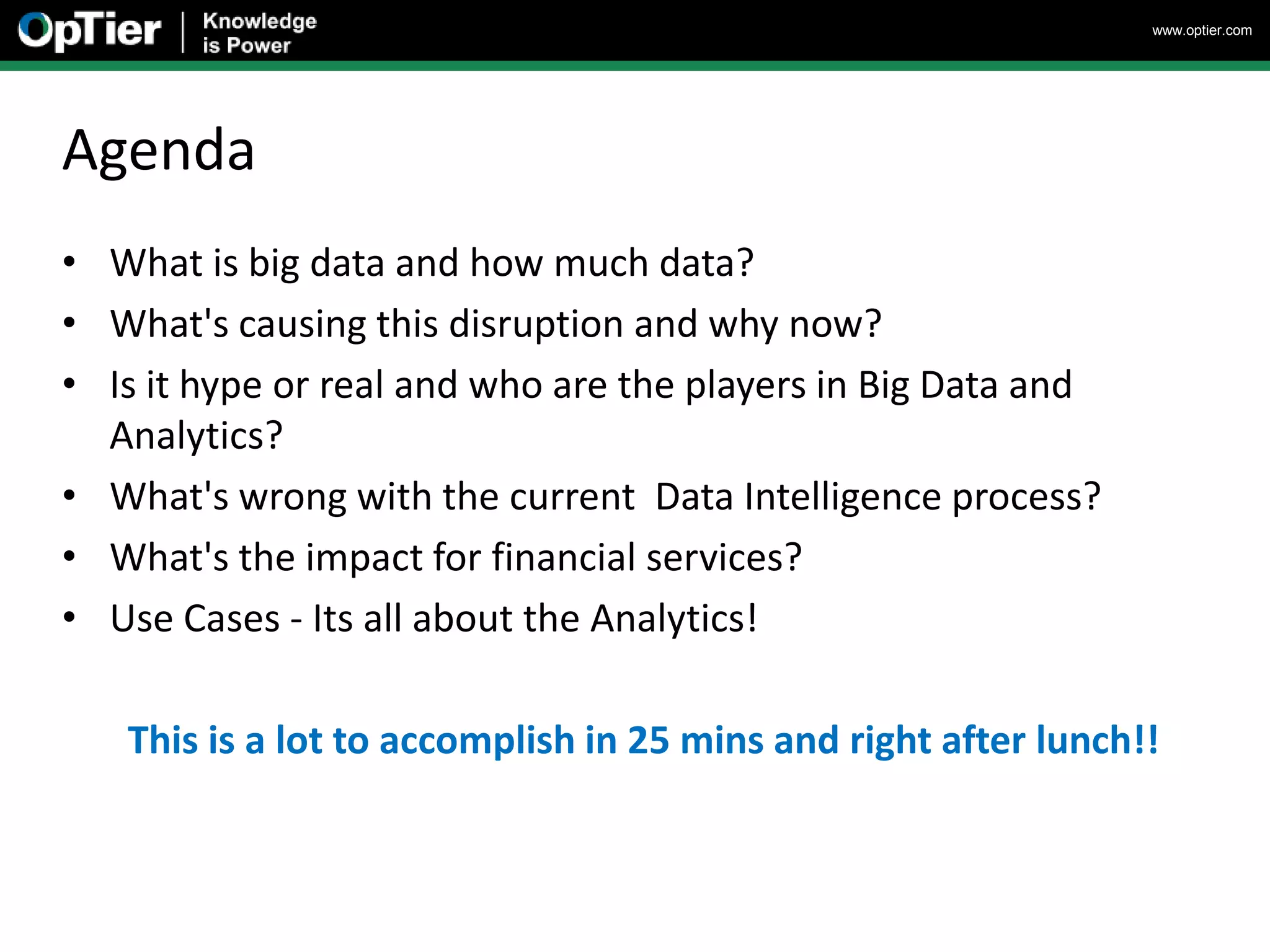 This document discusses big data and analytics, including how much data is being generated, what is driving this disruption, and who the major players are. It notes issues with current analytics approaches being slow and expensive. The document introduces OpTier's approach of establishing real-time business context across transactions to more quickly gain insights. Potential use cases for financial services are also outlined, such as fraud prevention, customer behavior analysis, and understanding the impact of IT performance on business outcomes.