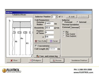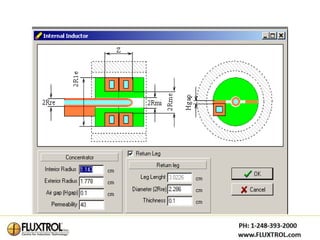 This document discusses the optimal design of internal induction coils for surface heating. It examines different coil designs like the inductor with central rod, hairpin, single-turn cylindrical, and multi-turn cylindrical coils. The study compares the performance of coils with and without magnetic cores and return legs. It finds that magnetic flux controllers with cores and poles drastically improve coil performance by increasing efficiency and power factor. While return legs only introduce small losses, they can cause significant voltage drops. Proper design of the magnetic core is essential for optimal coil induction heating performance.