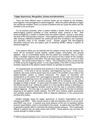 This document discusses obtaining optimal patient-ventilator synchrony. It describes three phases of patient-ventilator interaction: triggering, breath delivery, and cycling. Trigger asynchrony can occur if the ventilator does not respond quickly enough to the patient's effort. Breath delivery asynchrony may happen if the ventilator does not provide enough flow. Cycling asynchrony can result if the neural inspiration time does not match the mechanical inspiration time. The document provides tips for recognizing and addressing asynchrony issues, such as adjusting ventilator settings and modes. The overall goal is to minimize patient discomfort and optimize lung protection and recovery.