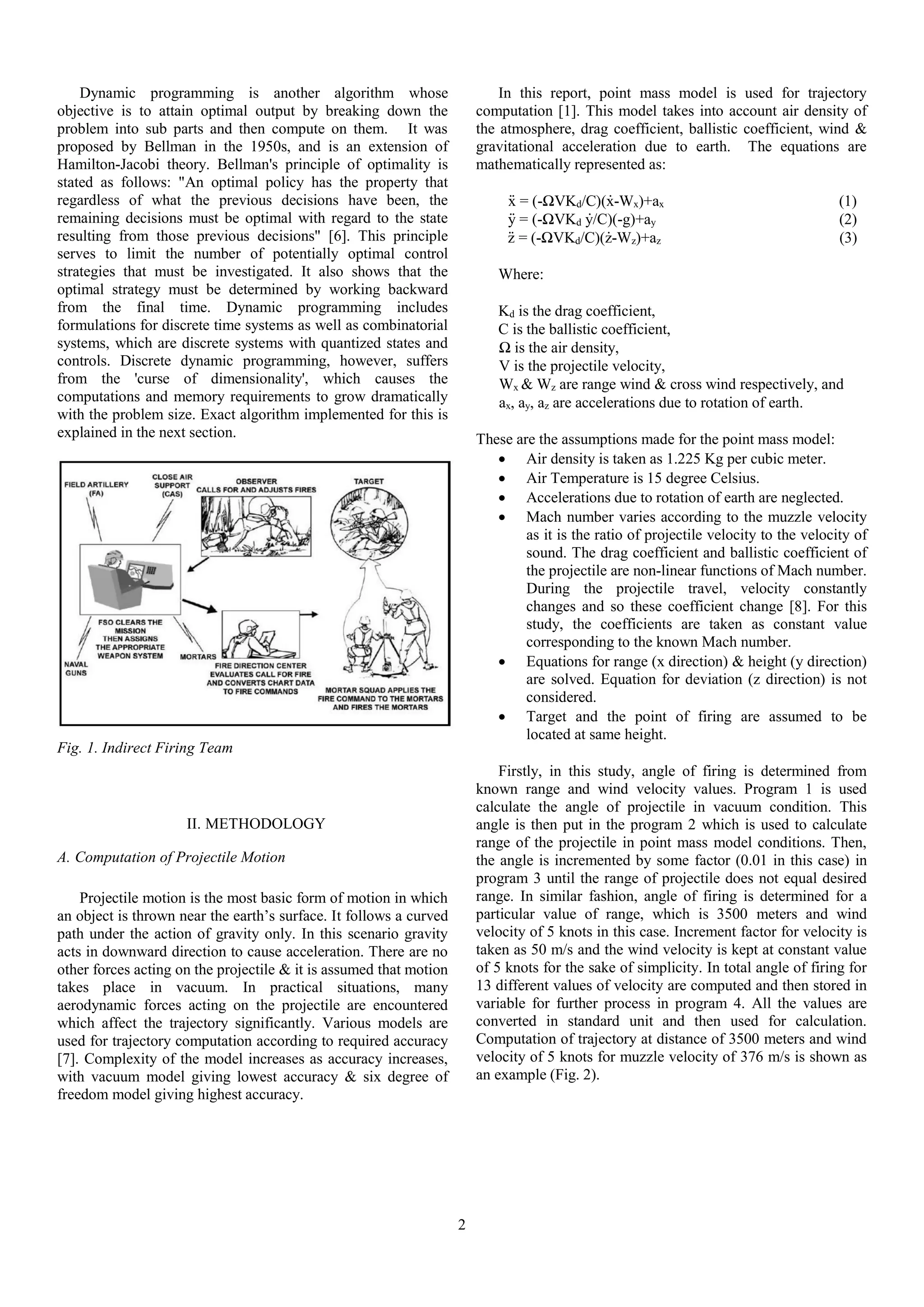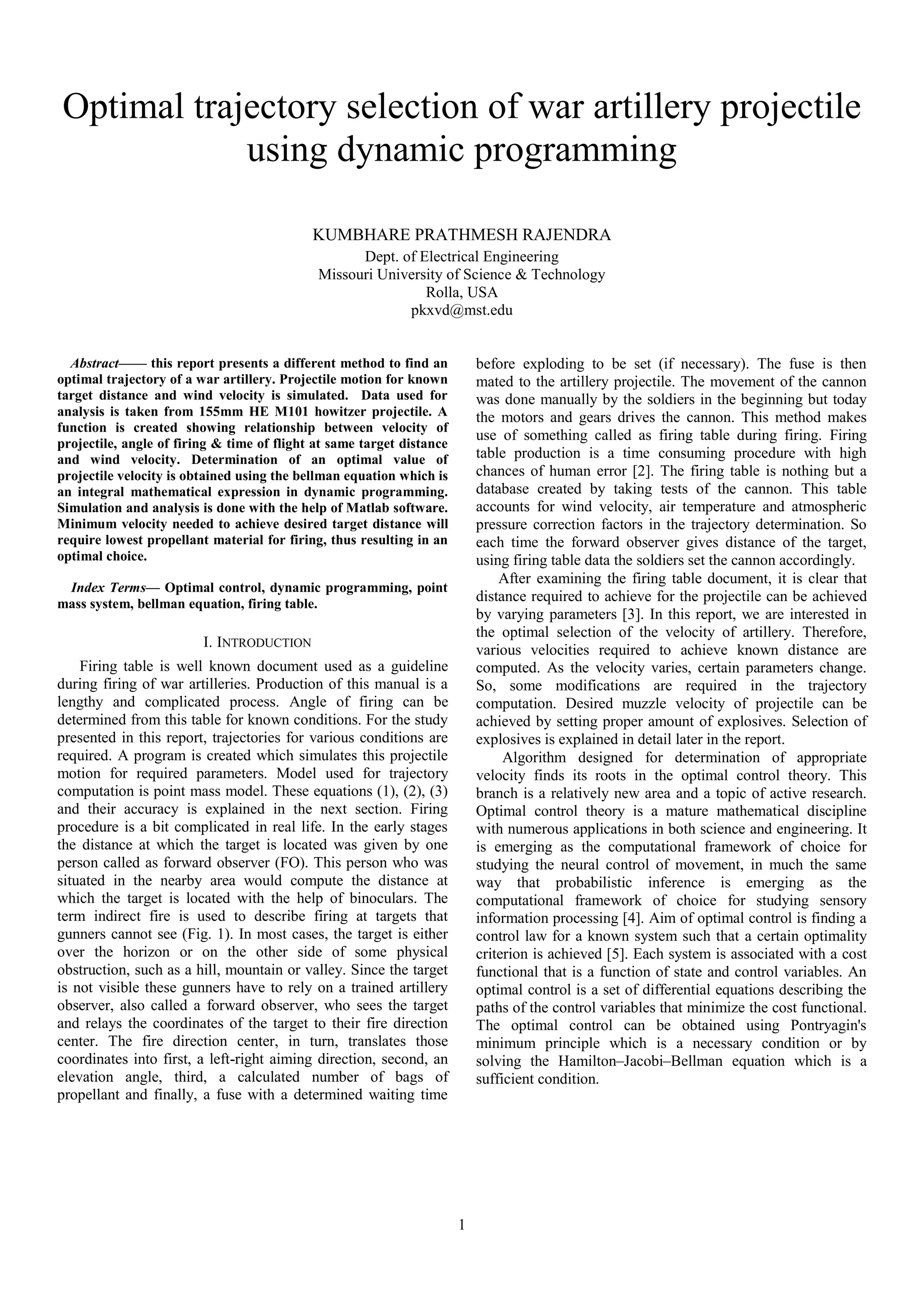 This document discusses finding the optimal trajectory for an artillery projectile using dynamic programming. It first describes the methodology used, including modeling the projectile motion and factors that affect the trajectory like wind velocity. It then discusses using muzzle velocity as the criterion to determine the optimal selection. Different combinations of muzzle velocity and angle of firing are computed to hit a target at a given distance. Finally, it explains how a dynamic programming algorithm is applied using these combinations and the Bellman equation to determine the minimum velocity needed to hit the target, which is the optimal choice as it requires the lowest amount of propellant.