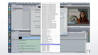 This document discusses digital video codecs and compression. It begins by defining pixel resolutions for standard definition, high definition, and digital cinema. It then covers CMOS image sensors used for HD, 2K and 4K capture and explains intra-frame and inter-frame compression. The document provides an example of the Apple ProRes 422 codec and analyzes its key attributes. It also discusses interlaced vs progressive scanning, picture impairments from compression, digital cinema standards, and predicts that requirements on compression will reduce over time due to technological advances.