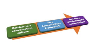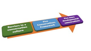 The document outlines the importance of effective leadership and communication in enhancing team performance, highlighting statistics that indicate widespread issues in engagement and trust among employees. It presents a framework for conducting essential conversations aimed at improving job satisfaction, strengths, growth opportunities, and innovation. Additionally, it identifies common barriers to communication and emphasizes the necessity of regular, constructive dialogues between leaders and team members.
