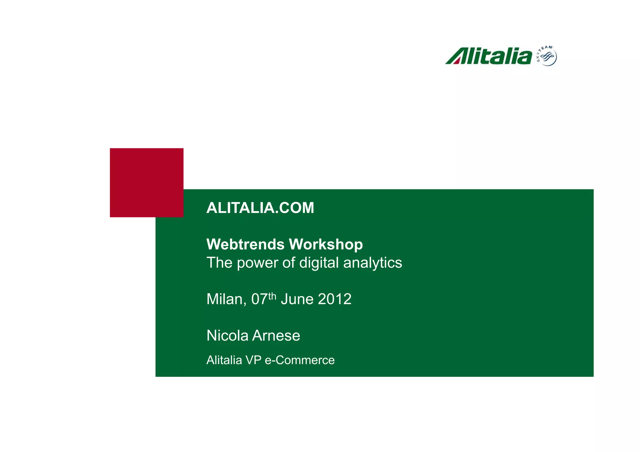 The document discusses Alitalia's digital analytics strategy and optimization efforts. It aims to (1) make all products and services available online, (2) provide intuitive user experiences, (3) engage customers directly to build loyalty. Alitalia uses WebTrends to measure key metrics, share data between departments, and optimize pages based on A/B testing. Testing of special offer pages found font size and button changes increased conversions by up to 5.56%. Future efforts include segment testing and personalization to create customized experiences on Alitalia.com.