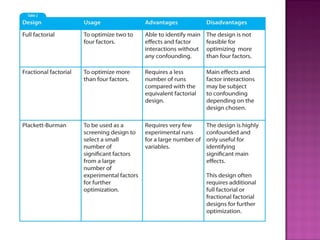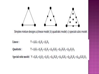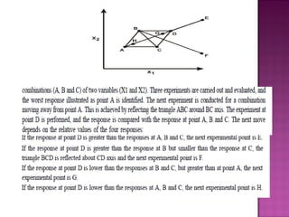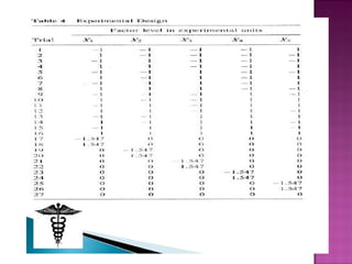 The document discusses optimization in pharmaceutical formulation and processing. It defines optimization as choosing the best alternative from available options. Optimization in pharmacy involves formulating drug products using the best combination of ingredients and processing parameters. Experimental design techniques are used to optimize multiple variables. Response surface methodology and central composite designs are commonly used to model quadratic relationships between variables. The document outlines different types of experimental designs and their applications in pharmaceutical optimization.