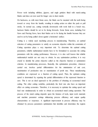 2) It provides background on cutting processes and discusses how optimization can increase productivity by minimizing costs and production time. Common optimization objectives are minimizing unit cost, maximizing production rate or profit rate.