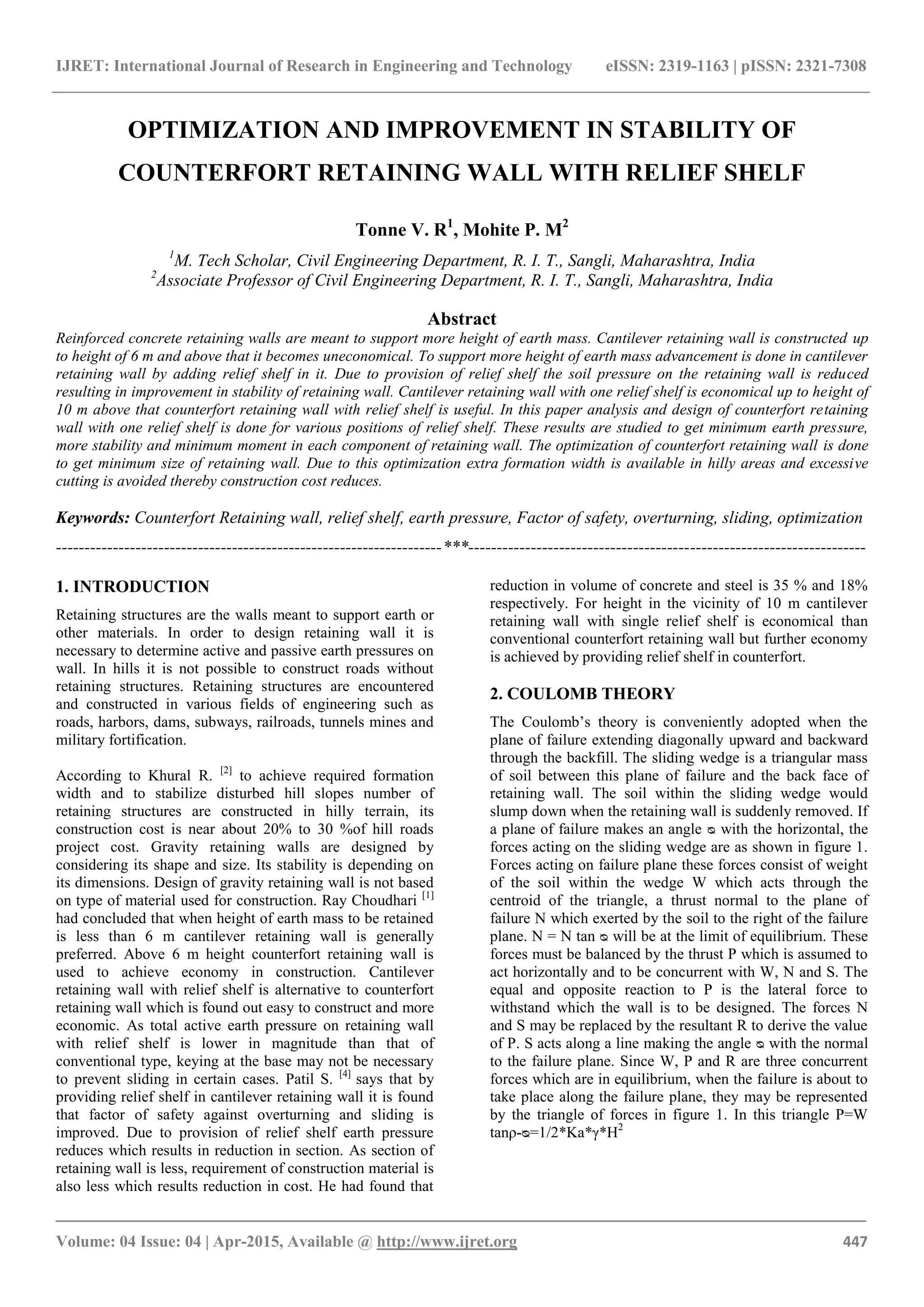 This document discusses the optimization and stability improvement of counterfort retaining walls with relief shelves in civil engineering. It presents an analysis to determine the best position for the relief shelf, ensuring reduced earth pressure and enhancing wall stability for various wall heights. Findings indicate that the optimal shelf positioning and design adjustments lead to significant reductions in construction material, costs, and cross-sectional dimensions of the walls.