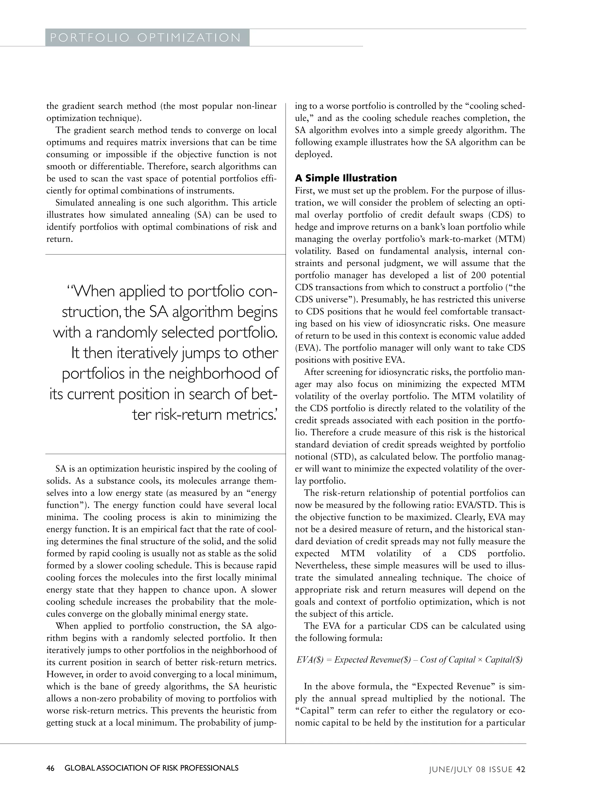This document discusses using simulated annealing (SA) as an algorithm to optimize portfolios by finding optimal combinations of risk and return. SA is presented as an alternative to gradient search methods which tend to get stuck in local optima. The SA algorithm begins with a random portfolio and iteratively explores neighboring portfolios to search for better risk-return metrics. It allows for some probability of accepting worse portfolios to avoid local optima. Step-by-step instructions are provided for implementing an SA algorithm along with an example application to optimizing a credit default swap portfolio. The SA approach is shown to outperform a greedy search algorithm in finding superior risk-return portfolios.