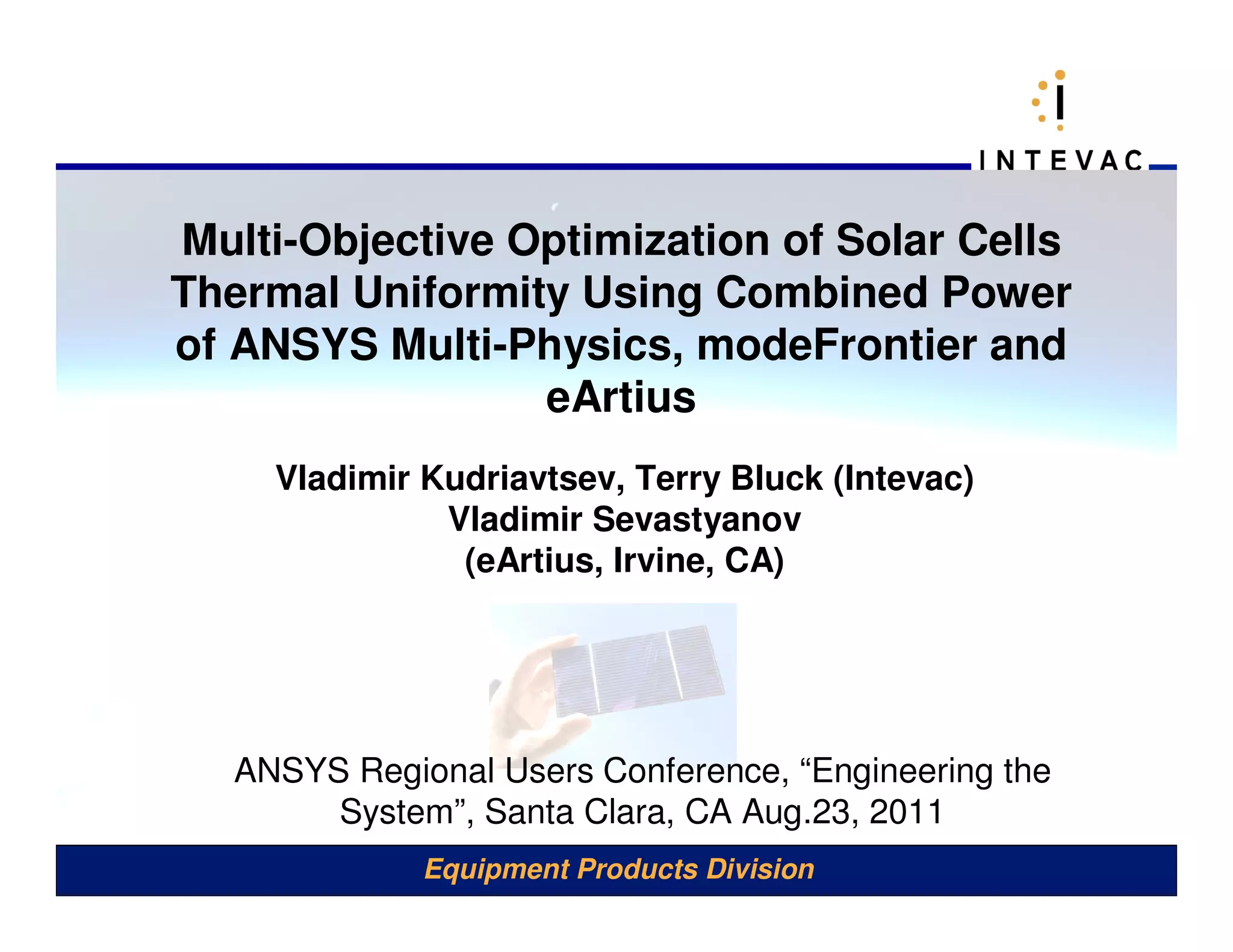This document discusses using ANSYS, modeFrontier, and eArtius software to optimize the thermal uniformity of solar cells through multi-objective optimization of lamp heating parameters. The optimization aims to minimize temperature differences across substrates during heating while meeting temperature requirements. ModeFrontier acts as an optimization scheduler and data analyzer while eArtius provides multi-objective optimization methods to guide the selection of better input variables to satisfy the design objectives.