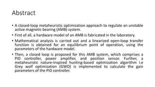 1) A hardware model of an active magnetic bearing system is constructed. Mathematical analysis is used to obtain an open-loop transfer function, making the system unstable.