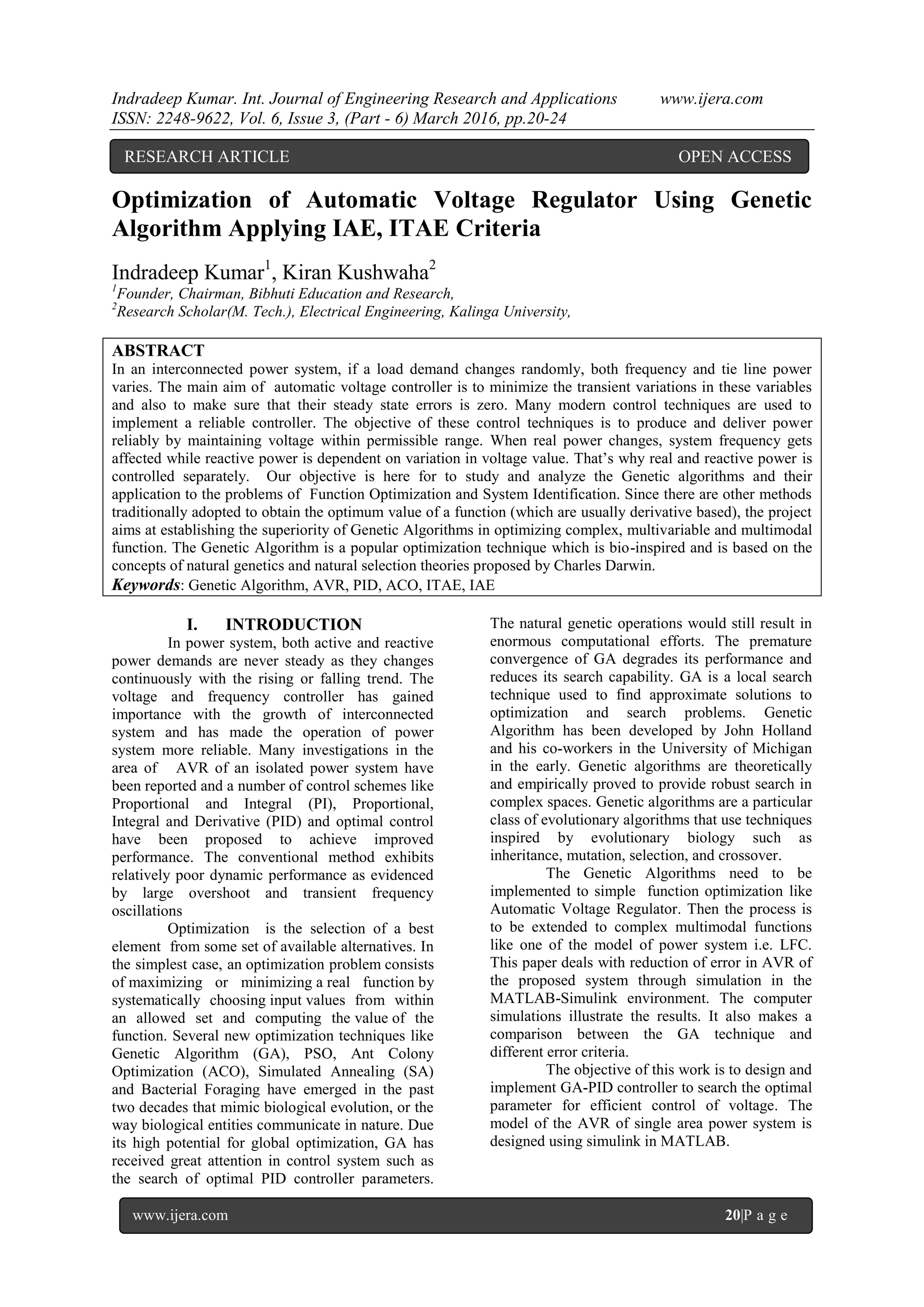 This document discusses the optimization of automatic voltage regulators (AVR) using genetic algorithms (GA), emphasizing their effectiveness in minimizing transient variations in power systems. It compares the performance of GA with other traditional control methods, specifically focusing on Integral Absolute Error (IAE) and Integral Time Absolute Error (ITAE) criteria, and concludes that while ITAE outperforms IAE in overshoot, IAE is superior in minimizing settling time. Simulations conducted using MATLAB demonstrate the robustness of GA in determining optimal PID controller parameters for AVR systems.
