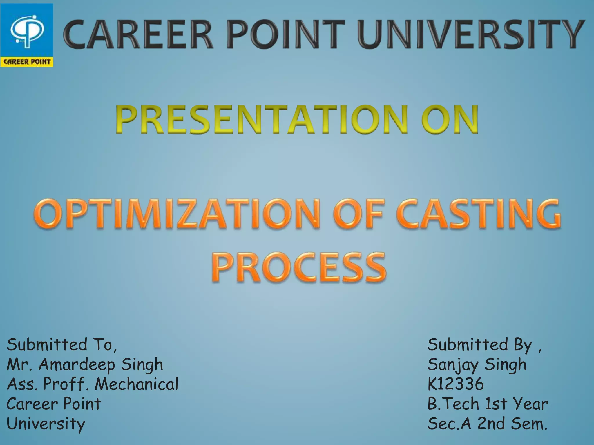 The document discusses the casting manufacturing process, detailing its definition, various types, and the use of simulation for quality assurance and optimization. It emphasizes the importance of casting process simulation in predicting defects and enhancing component quality, leading to cost savings and improved production efficiency. It also highlights the benefits of optimization to avoid under or over design, ultimately achieving better yields and reduced production costs.