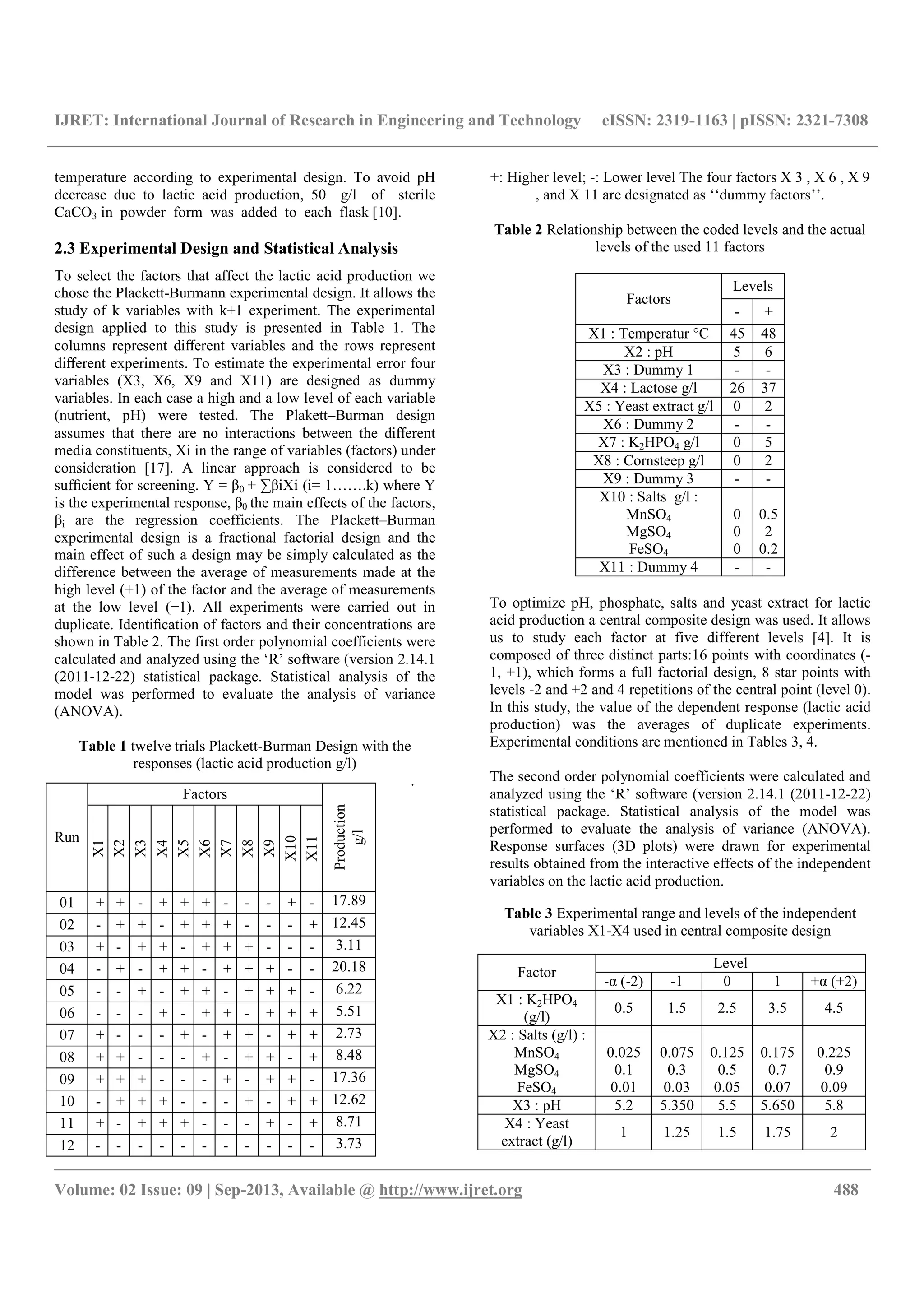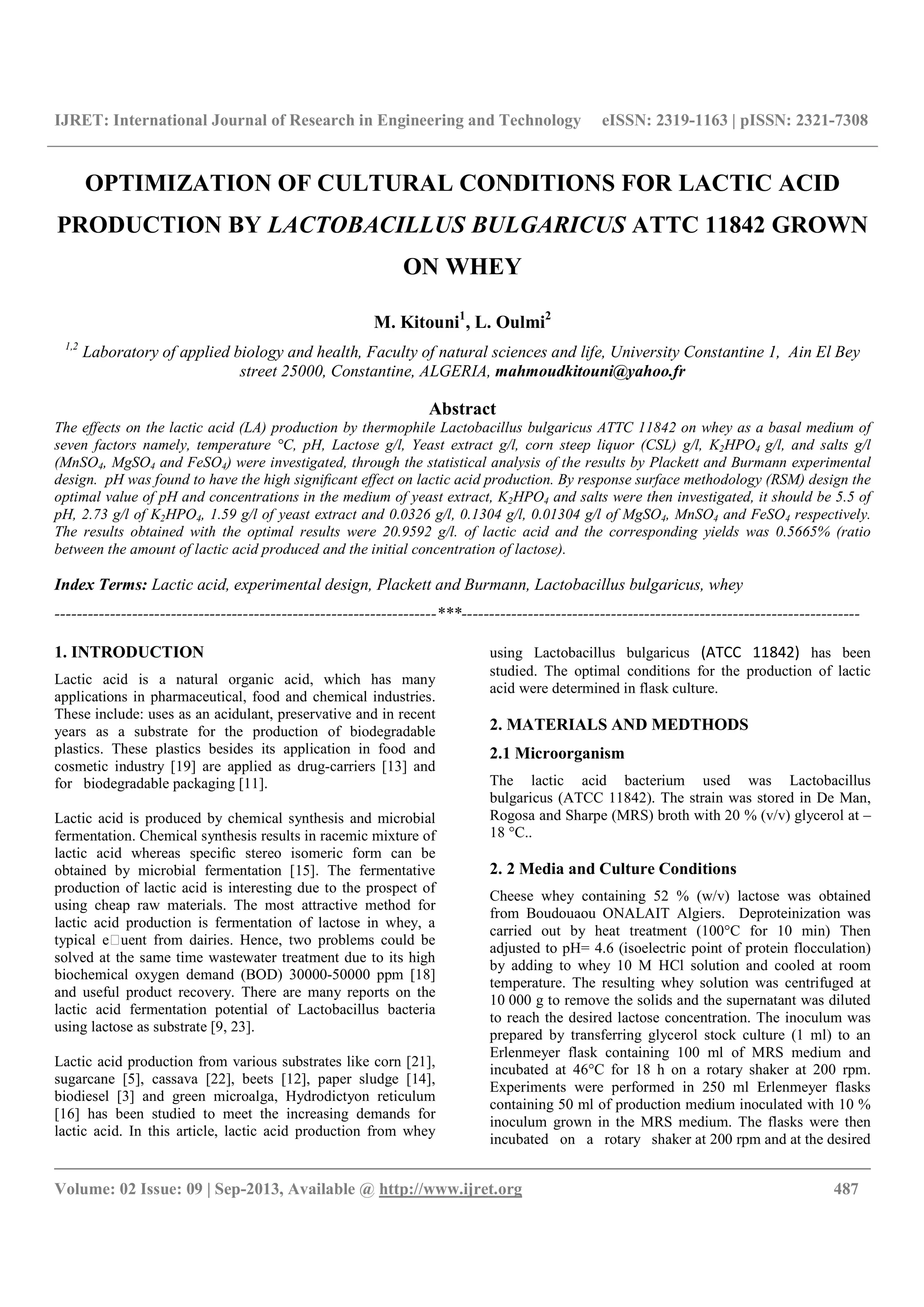 This study investigates the optimization of lactic acid production by Lactobacillus bulgaricus ATCC 11842 using whey as a medium, analyzing the effects of various factors such as temperature, pH, and nutrient concentrations through experimental designs, notably Plackett-Burmann and response surface methodology. The findings indicate that pH significantly influences lactic acid production, with optimal conditions identified at a pH of 5.5 and specific concentrations of nutrients leading to a maximum yield of 20.9592 g/l of lactic acid. The study highlights the potential of using dairy waste as a substrate for microbial fermentation to produce valuable lactic acid while addressing wastewater management.