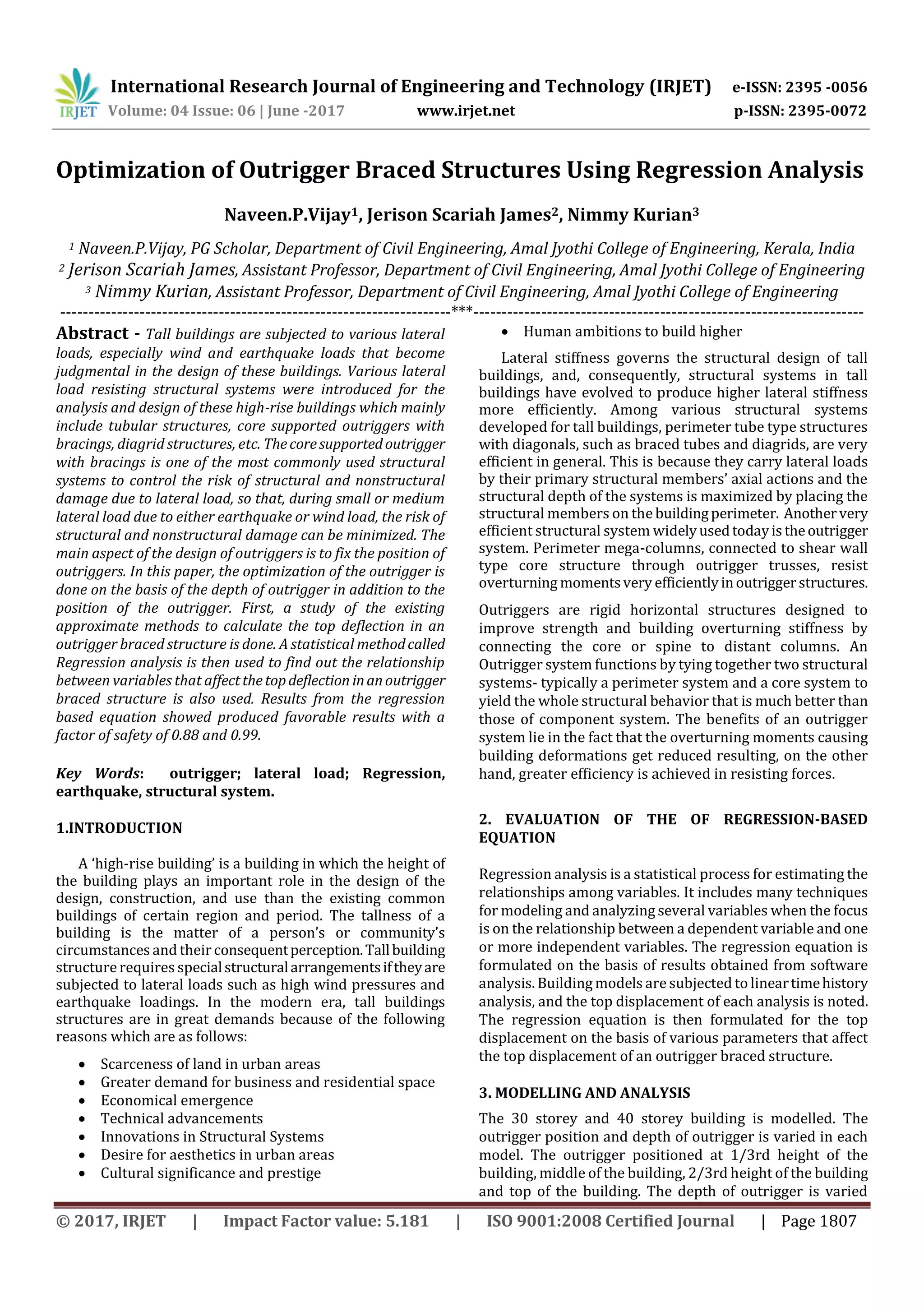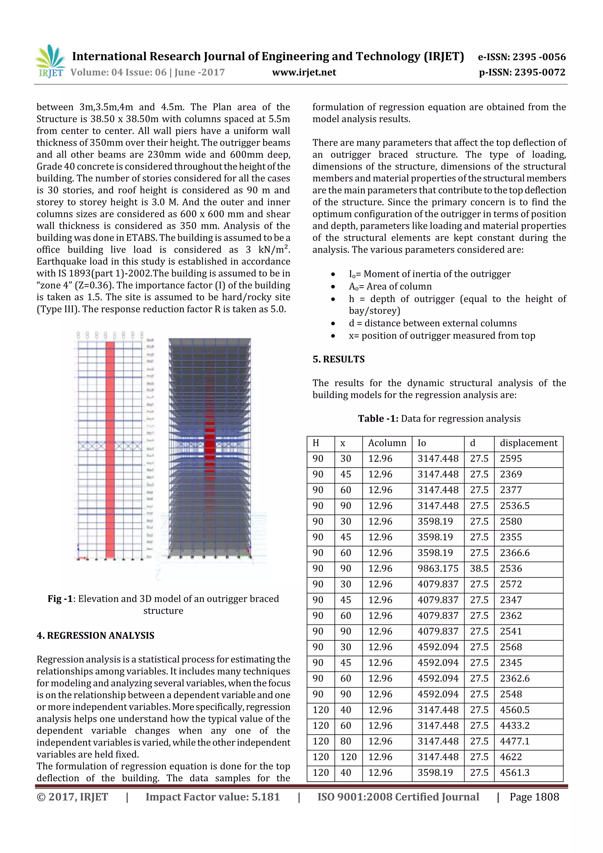 This document discusses the optimization of outrigger braced structures using regression analysis. Tall buildings require special structural systems to resist lateral loads from wind and earthquakes. Outrigger braced structures are commonly used as they efficiently resist overturning moments. The document studies existing methods to calculate top deflection in outrigger structures. It then uses regression analysis to develop a relationship between variables that affect top deflection. Building models are analyzed varying outrigger position and depth, and the regression equation is formulated based on parameters like outrigger properties and dimensions. Results show the regression-based equation produces favorable results with safety factors of 0.88-0.99 compared to other methods.