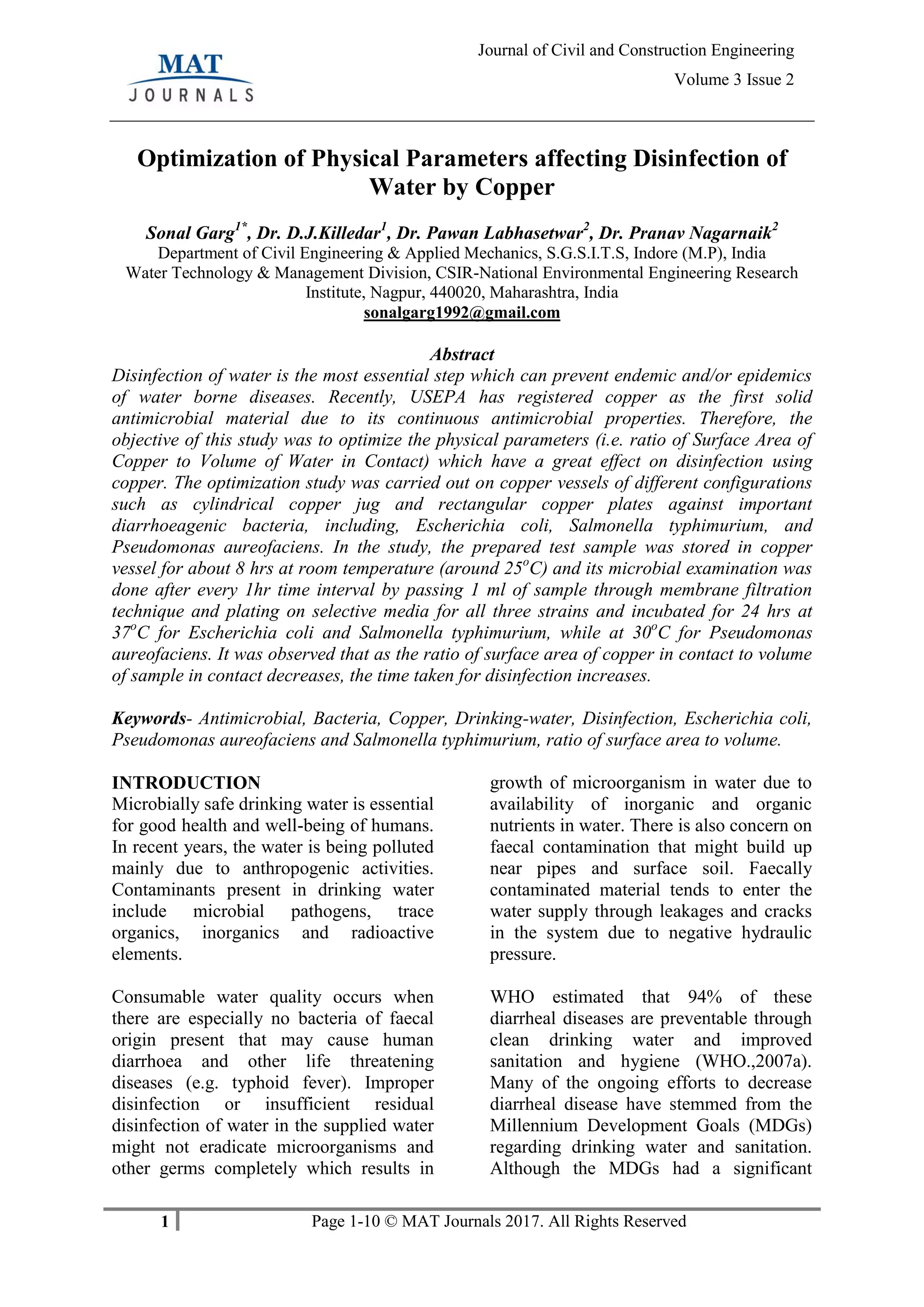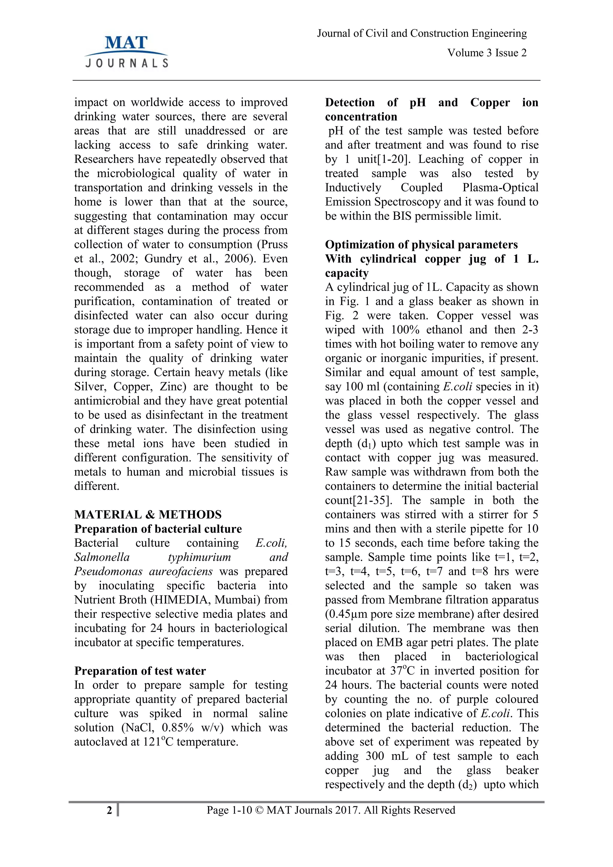 This study investigates the optimization of physical parameters, specifically the ratio of surface area of copper to the volume of water, which significantly affects the disinfection of water using copper against bacteria like E. coli and Salmonella. Conducted using cylindrical copper jugs and rectangular copper plates, the results indicate that a decreased surface area to volume ratio increases the time required for disinfection, with an optimal ratio of 0.36 achieving maximum bacterial reduction. These findings validate copper's antimicrobial properties and its potential application in safe drinking water storage.