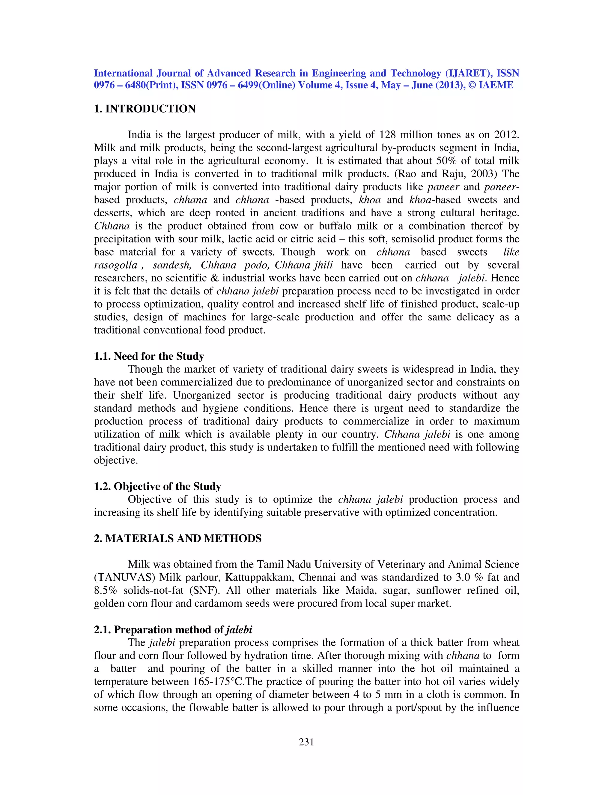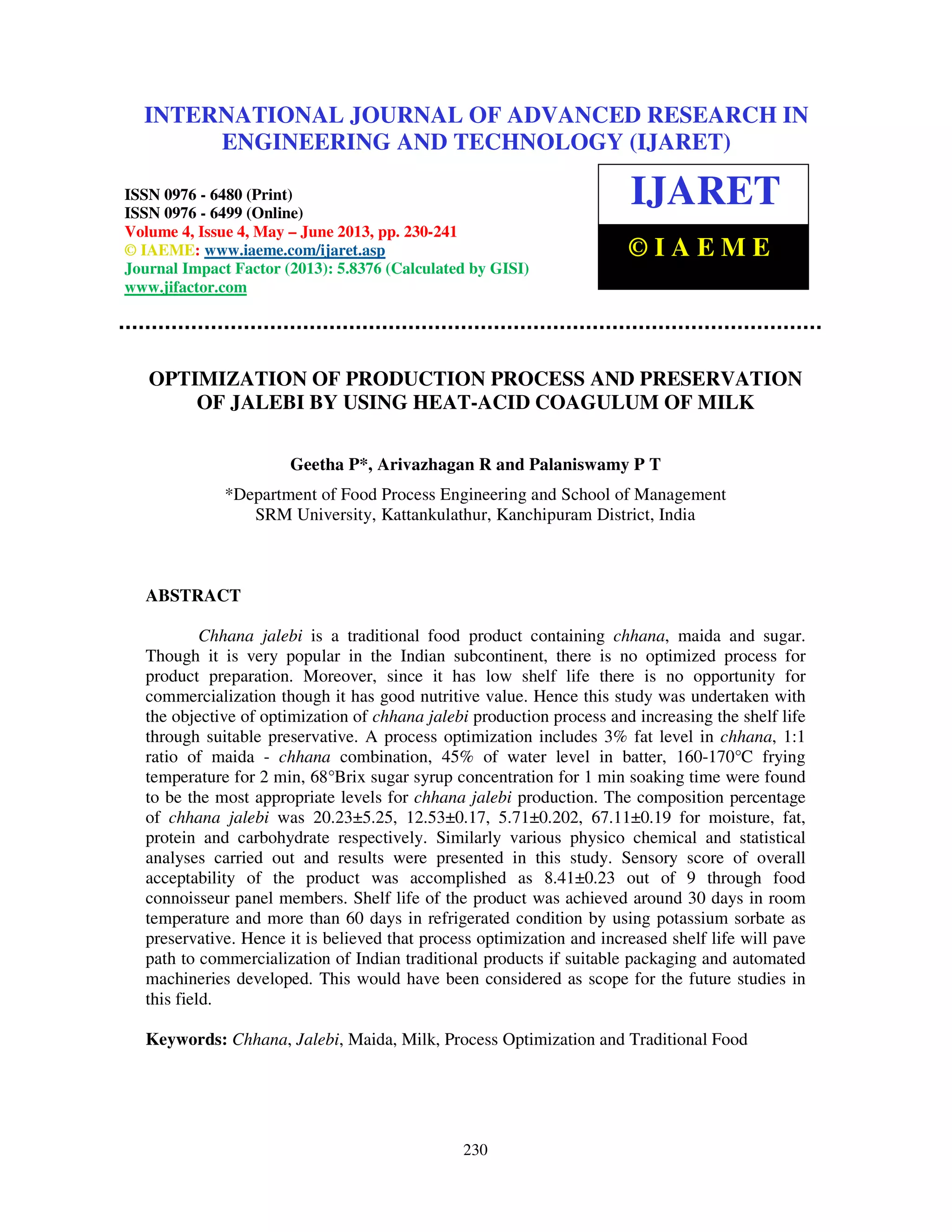 This study aimed to optimize the production process and increase the shelf life of chhana jalebi, a traditional Indian sweet. Various parameters were tested, including milk fat content, ratios of ingredients in the batter, water level, frying time and temperature, and sugar syrup concentration. Sensory evaluation was conducted to determine the optimal levels. The optimized process used milk with 3% fat, a 1:1 ratio of chhana to maida flour, 45% water in the batter, frying at 160-170°C for 2 minutes, and soaking in 68°Brix sugar syrup for 1 minute. Using potassium sorbate as a preservative increased the shelf life to 30 days at room temperature and over
