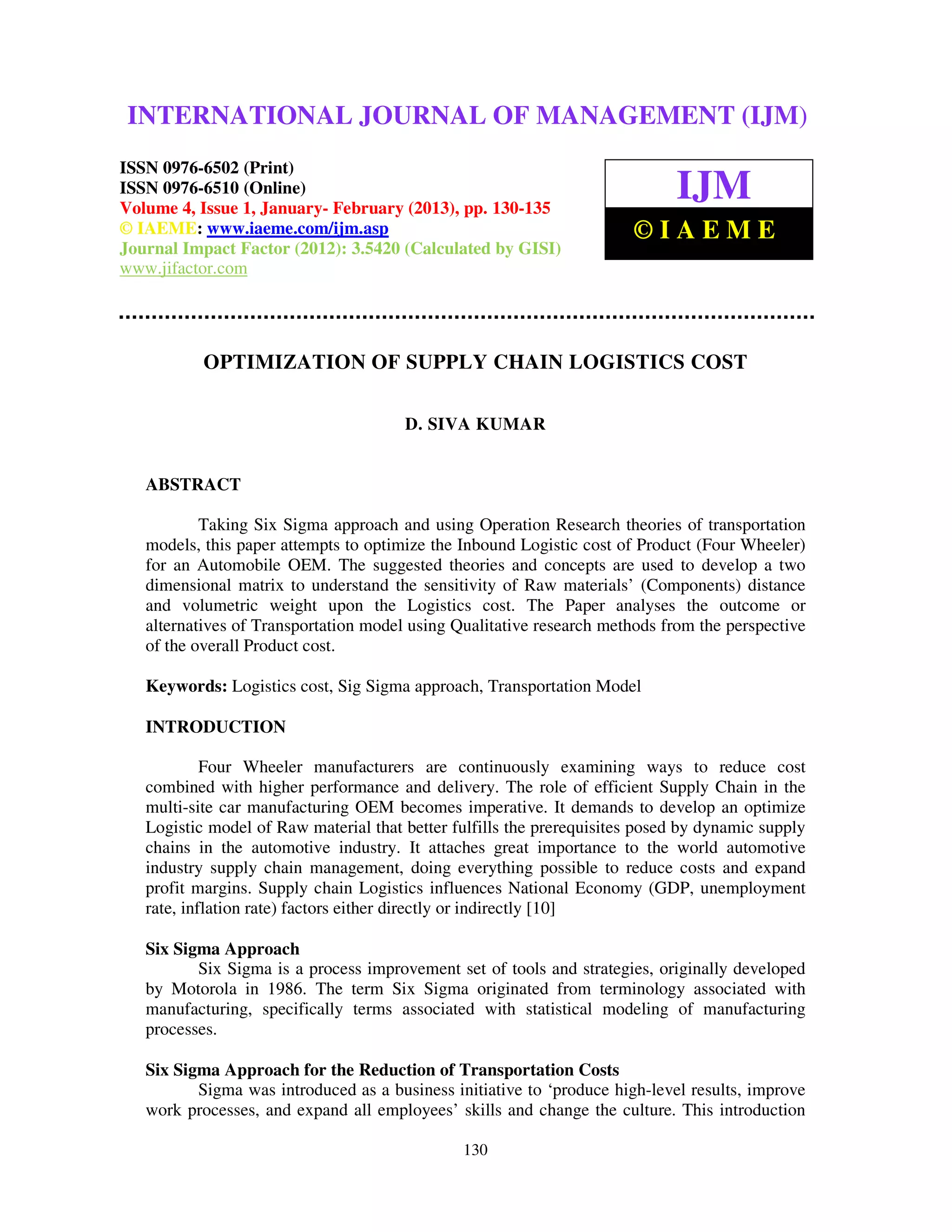 The document summarizes an article from the International Journal of Management that examines optimizing supply chain logistics costs for an automobile OEM. The article uses a Six Sigma approach and transportation models to develop a two-dimensional matrix analyzing how raw material distance and volumetric weight impact logistics costs. It applies a Define-Measure-Analyze-Improve-Control process and tools like fishbone diagrams and Minitab to identify cost reduction opportunities in a pipe manufacturing company's transportation system. A multi-criteria decision model is also formulated to evaluate optimized transportation solutions considering total product costs.