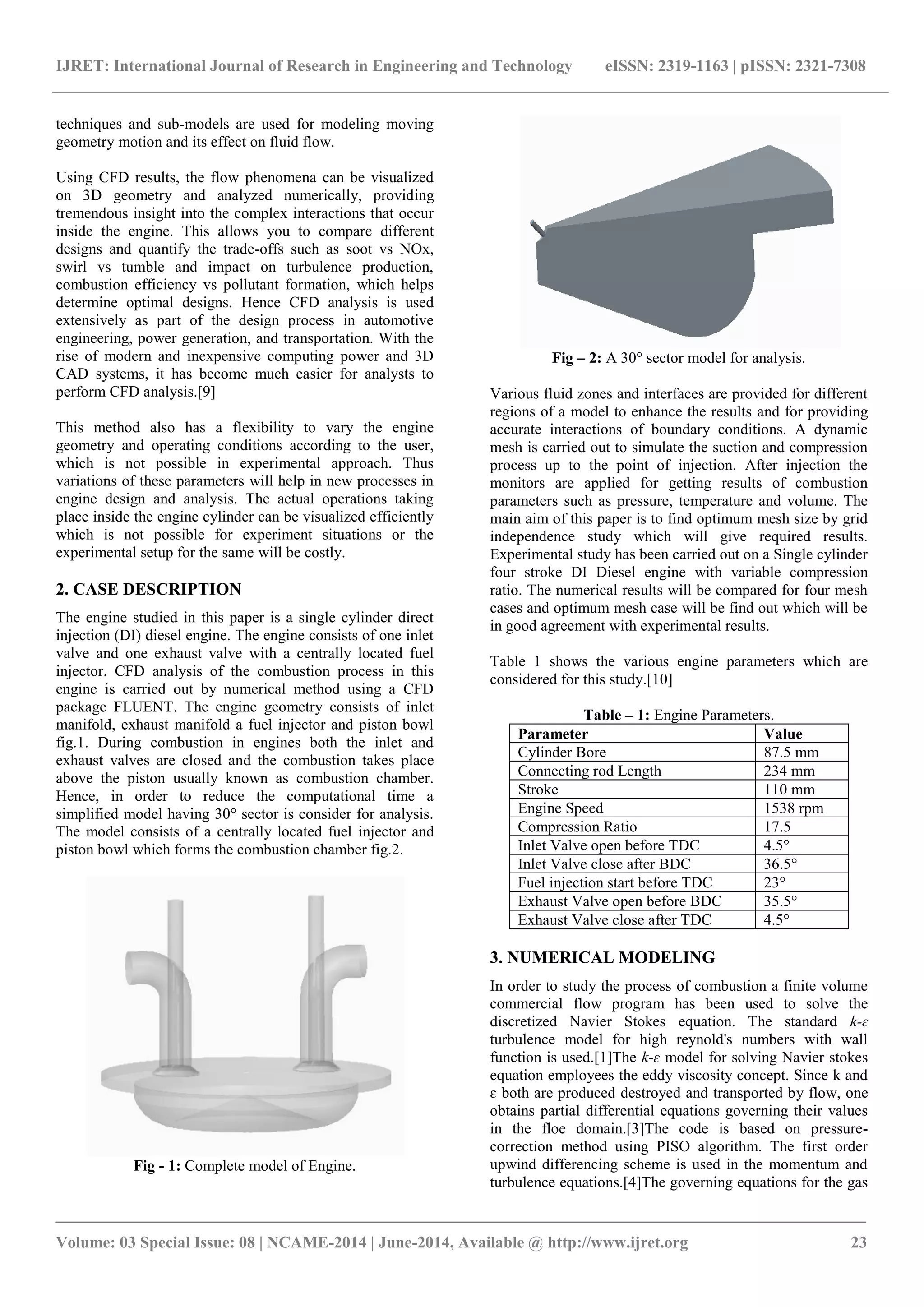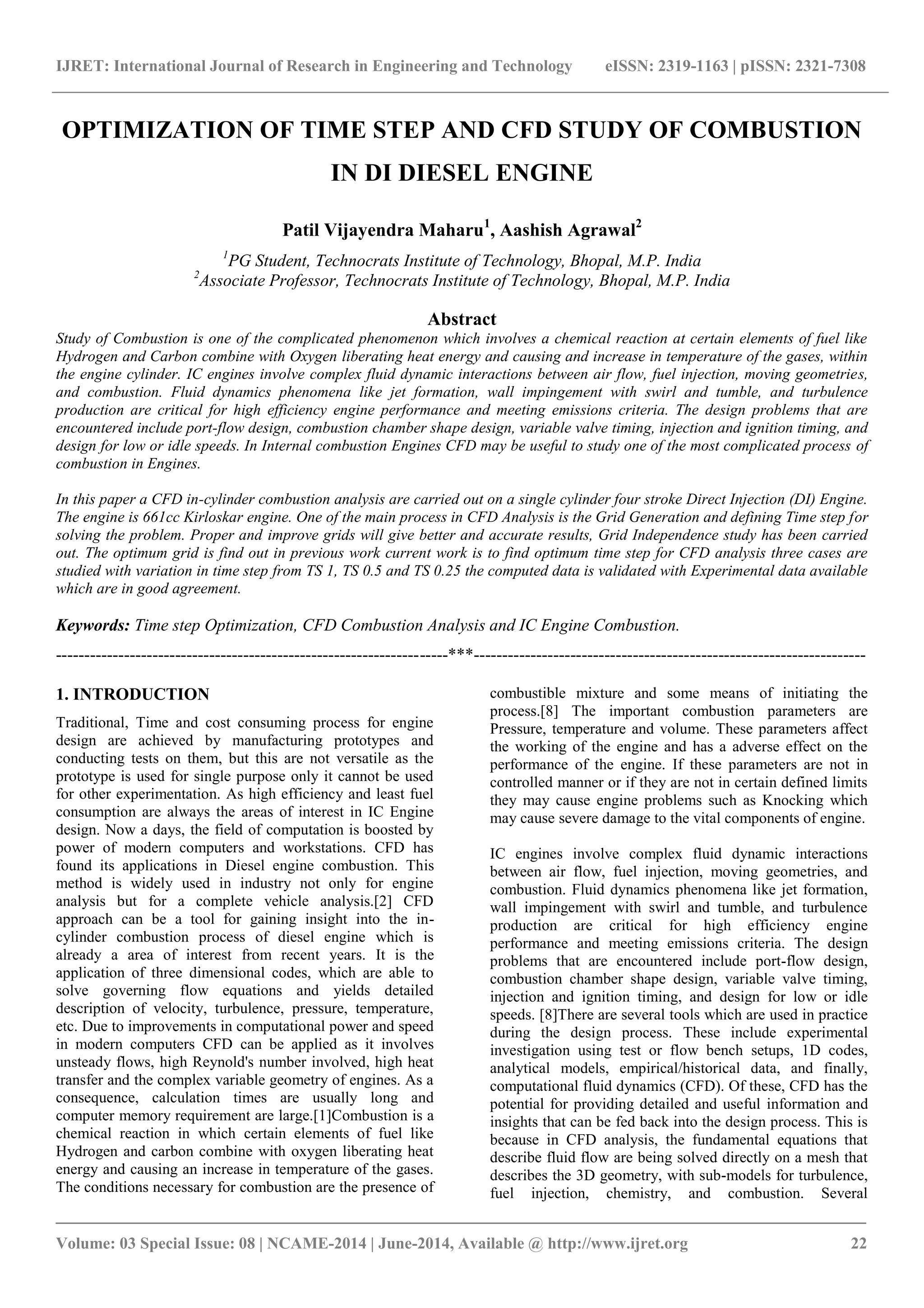This document discusses the optimization of time step and computational fluid dynamics (CFD) analysis of combustion in a direct injection diesel engine. The study presents methods for improving engine design efficiency by using CFD to analyze complex fluid dynamic interactions during combustion, including a grid independence study to determine the optimal mesh size and time step for accurate simulations. Results indicate that a time step of 0.25 yields the best agreement between experimental and CFD data, providing valuable insights into in-cylinder combustion processes.