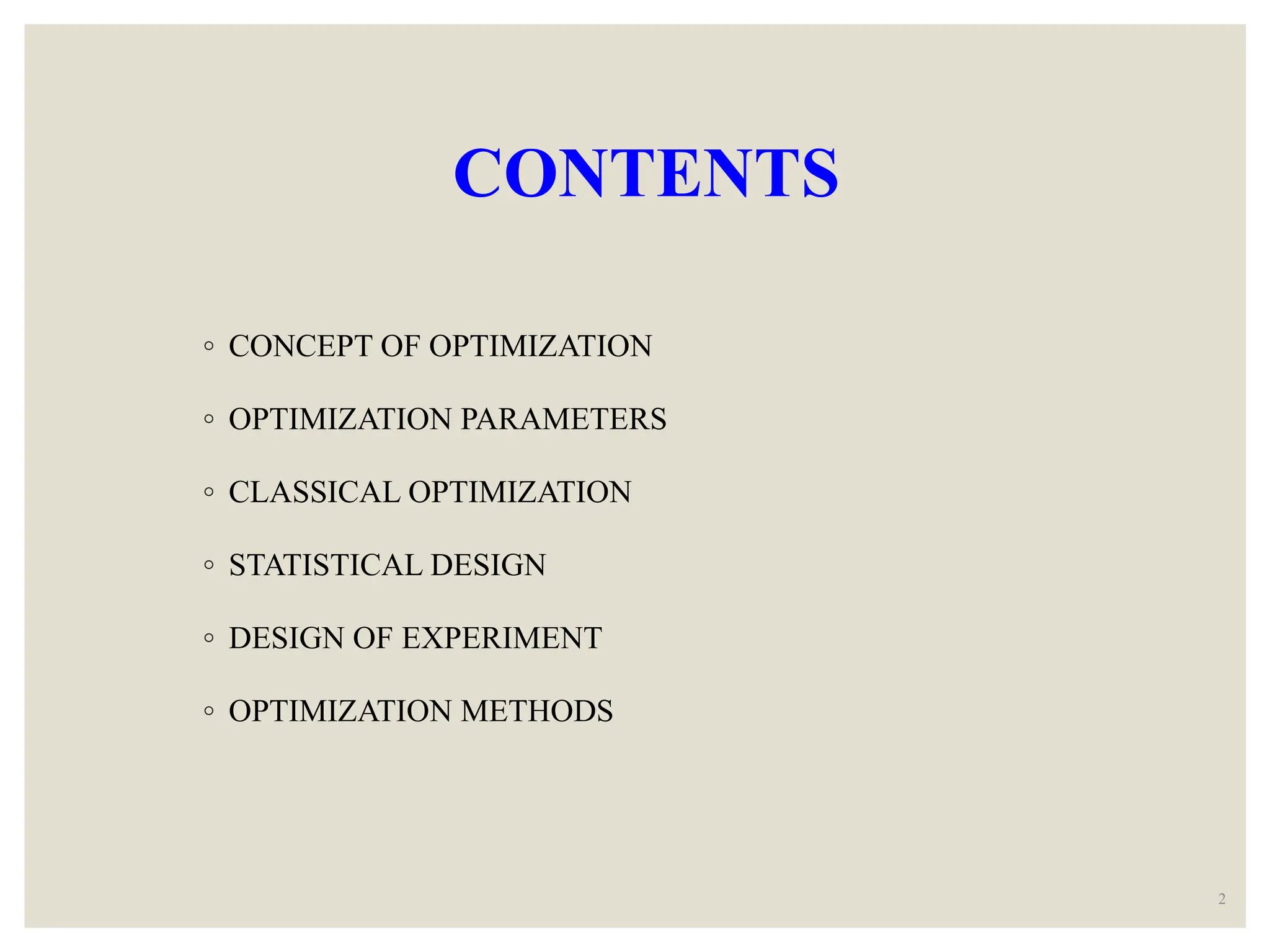 This document provides an overview of optimization in pharmaceutical formulations and processes. It defines optimization and discusses optimization parameters such as independent and dependent variables. It also describes various optimization methods including classical optimization, statistical design of experiments, evolutionary operations, simplex method, and Lagrangian method. Statistical design of experiments involves factorial designs, response surface designs, and other experimental designs. The overall goal of optimization is to develop a formulation or process that meets requirements in a cost-effective and efficient manner.