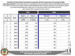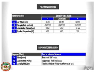 This document discusses various design of experiment methodologies including screening designs and optimization designs. It provides examples of factorial designs, response surface designs like central composite designs and Box-Behnken designs, and three-level full factorial designs. It also gives an example of using a fractional factorial design to screen critical processing parameters in a wet granulation coating process and selecting a three-level full factorial design to optimize two factors, blending speed and time, in a dry mixing process to investigate their interactive and quadratic effects on the response.