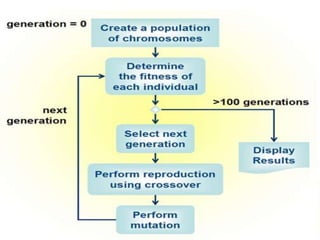 The document discusses various optimization techniques including evolutionary computing techniques such as particle swarm optimization and genetic algorithms. It provides an overview of the goal of optimization problems and discusses black-box optimization approaches. Evolutionary algorithms and swarm intelligence techniques that are inspired by nature are also introduced. The document then focuses on particle swarm optimization, providing details on the concepts, mathematical equations, components and steps involved in PSO. It also discusses genetic algorithms at a high level.