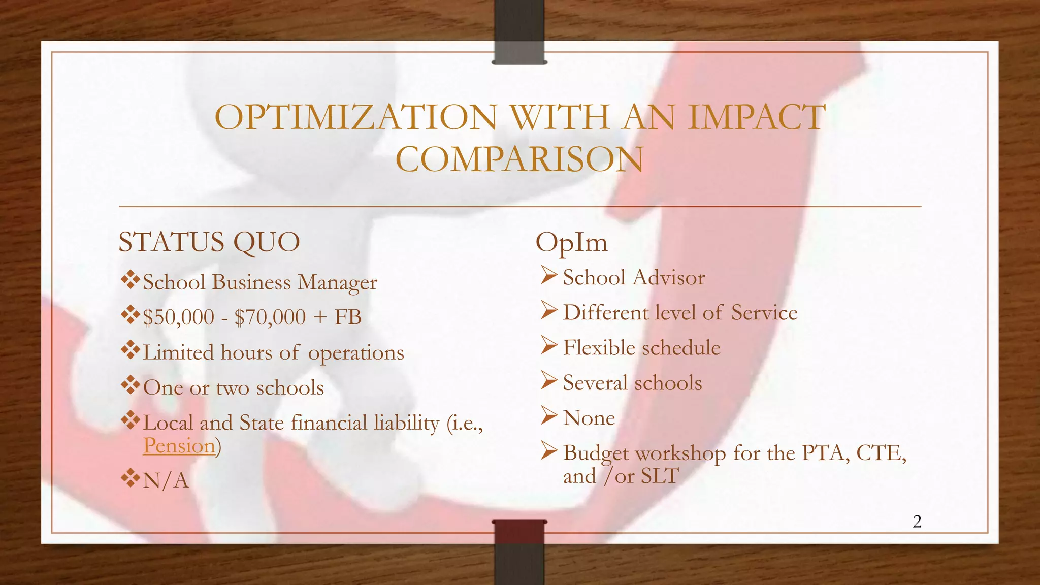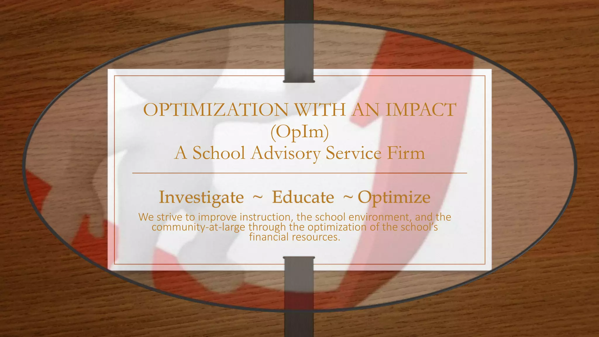 Optimization with an Impact (OPIM) is a school advisory service focused on enhancing instruction and school environments by optimizing financial resources. It offers various service levels at different costs, aimed to improve customer service, staff engagement, and compliance across multiple schools. OPIM's team, led by CEO Luis Taveras, brings over eight years of finance and operations experience and promotes budget workshops for participation from local stakeholders.