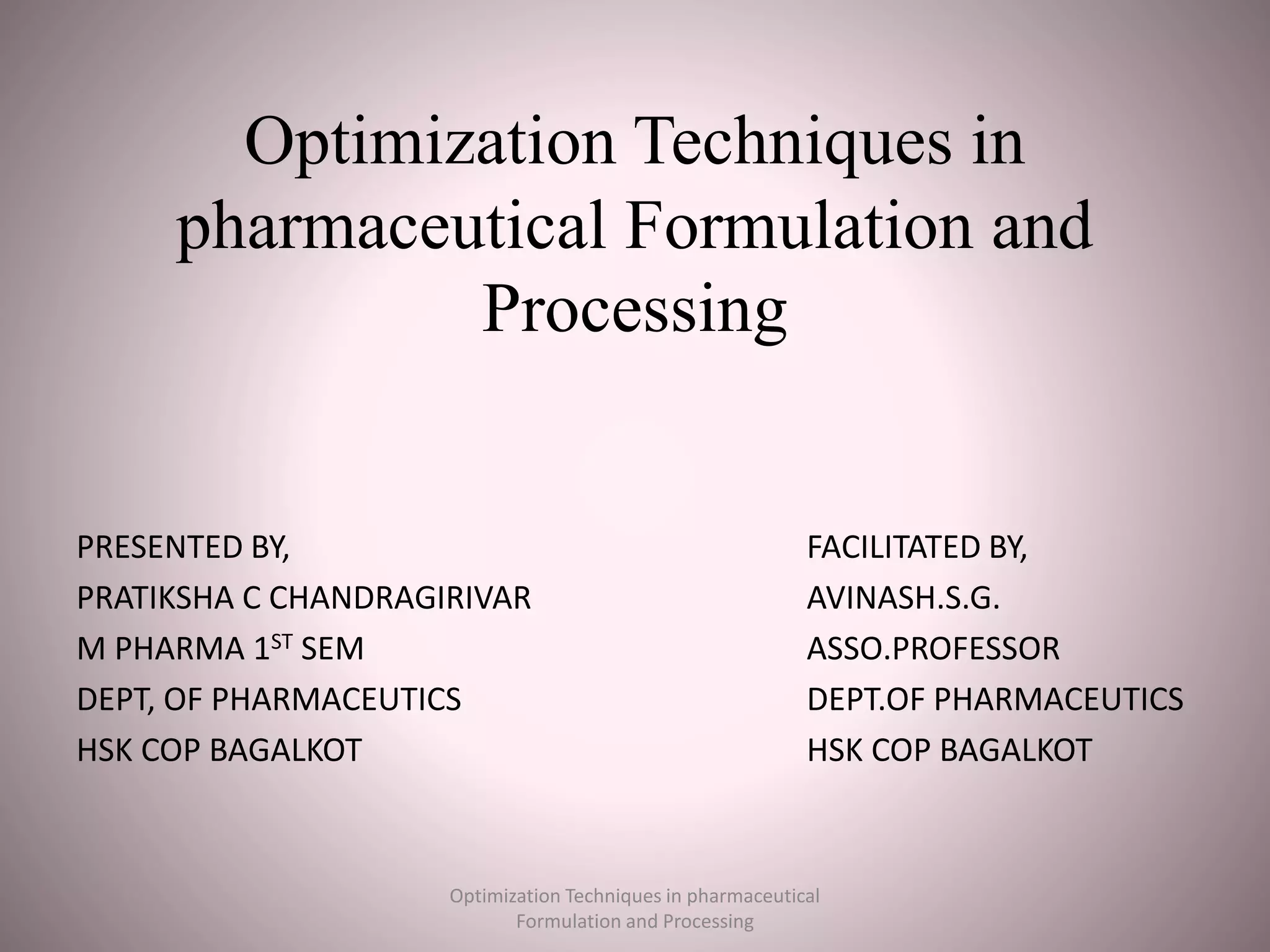 The document discusses optimization techniques used in pharmaceutical formulation and processing. It begins by defining optimization and its importance in developing drug products that meet bioavailability and mass production requirements. The key parameters of optimization include problem type (constrained vs unconstrained), variables (independent vs dependent), and techniques like evolutionary operations, simplex method, and Lagrangian method. Evolutionary operations involve repeated small changes to formulation or process to evolve the optimal product. Simplex method uses geometric shapes to navigate factor settings towards better responses. Lagrangian method applies polynomial models to experimental data to find the optimum based on responses like tablet hardness and friability.