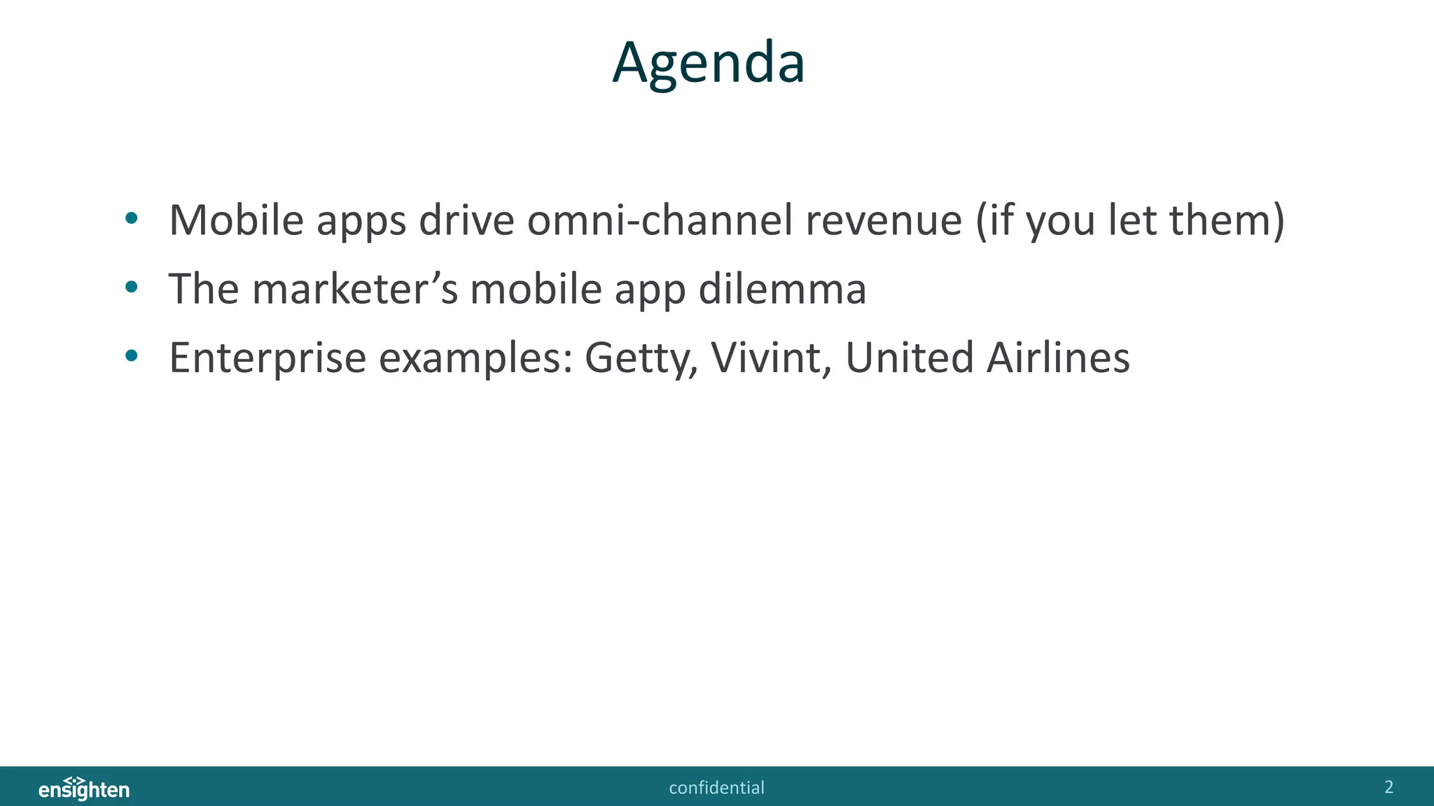 The document discusses the importance of optimizing mobile apps for driving omni-channel revenue and customer engagement, emphasizing the need for businesses to choose the right type of mobile app (native, hybrid, or web). It highlights key performance indicators (KPIs) for measuring mobile success and provides enterprise examples from companies like Getty, Vivint, and United Airlines, showcasing their innovative strategies and solutions. Furthermore, it promotes the benefits of a no-sdk approach in mobile app management to enhance user experiences and facilitate seamless customer interactions across channels.