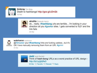 It discusses ways to optimize URL performance for AJAX applications, including using hash fragments, the HTML5 History API, and hijacking links to load content via AJAX while updating the URL. Hash fragments allow bookmarking of single page applications but require JavaScript. The HTML5 History API allows updating the URL without refreshing the page but has limited browser support. Hijacking links is a common technique to build AJAX/single page applications.