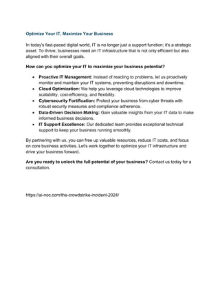 The document emphasizes the importance of IT as a strategic asset for businesses in today's digital landscape. It outlines key strategies for optimizing IT: proactive management, cloud optimization, cybersecurity, data-driven decision making, and excellent IT support. By leveraging these strategies, businesses can enhance efficiency, reduce costs, and focus on core activities.