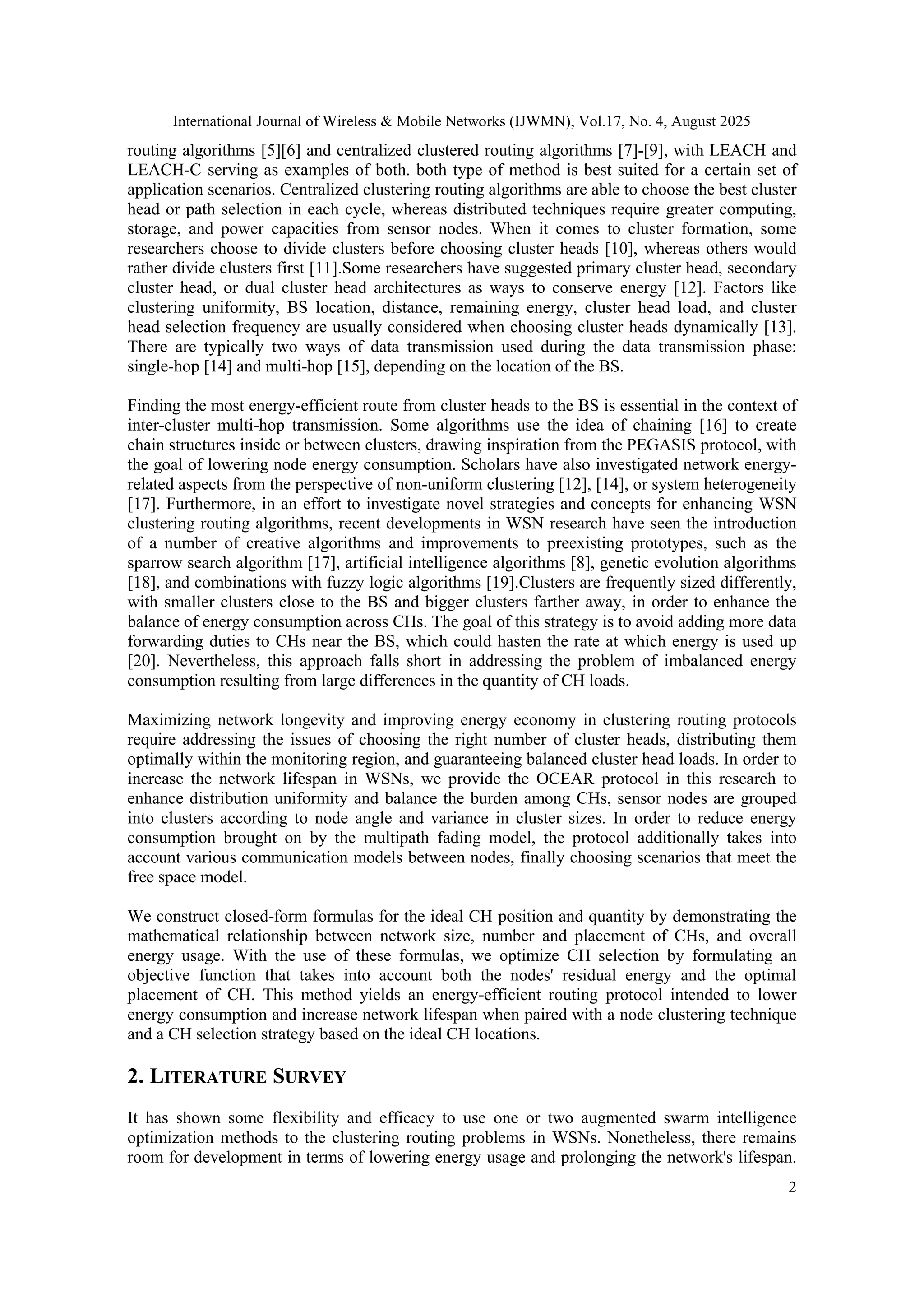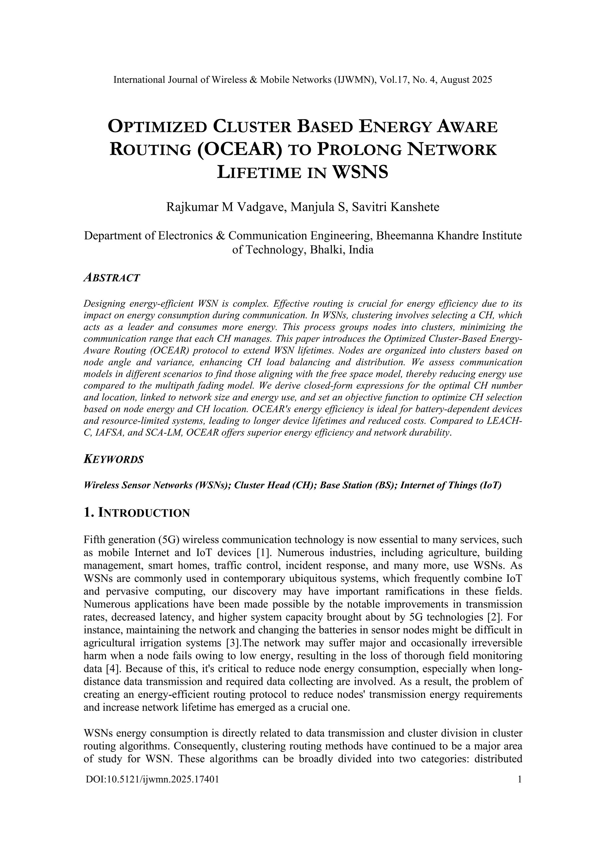 Designing energy-ef icient WSN is complex. Ef ective routing is crucial for energy ef iciency due to its impact on energy consumption during communication. In WSNs, clustering involves selecting a CH, whichacts as a leader and consumes more energy. This process groups nodes into clusters, minimizing thecommunication range that each CH manages. This paper introduces the Optimized Cluster-Based Energy- Aware Routing (OCEAR) protocol to extend WSN lifetimes. Nodes are organized into clusters based onnode angle and variance, enhancing CH load balancing and distribution. We assess communicationmodels in dif erent scenarios to find those aligning with the free space model, thereby reducing energy usecompared to the multipath fading model. We derive closed-form expressions for the optimal CHnumber and location, linked to network size and energy use, and set an objective function to optimize CHselectionbased on node energy and CH location. OCEAR's energy ef iciency is ideal for battery-dependent devices and resource-limited systems, leading to longer device lifetimes and reduced costs. Compared to LEACH- C, IAFSA, and SCA-LM, OCEAR of ers superior energy ef iciency and network durability.