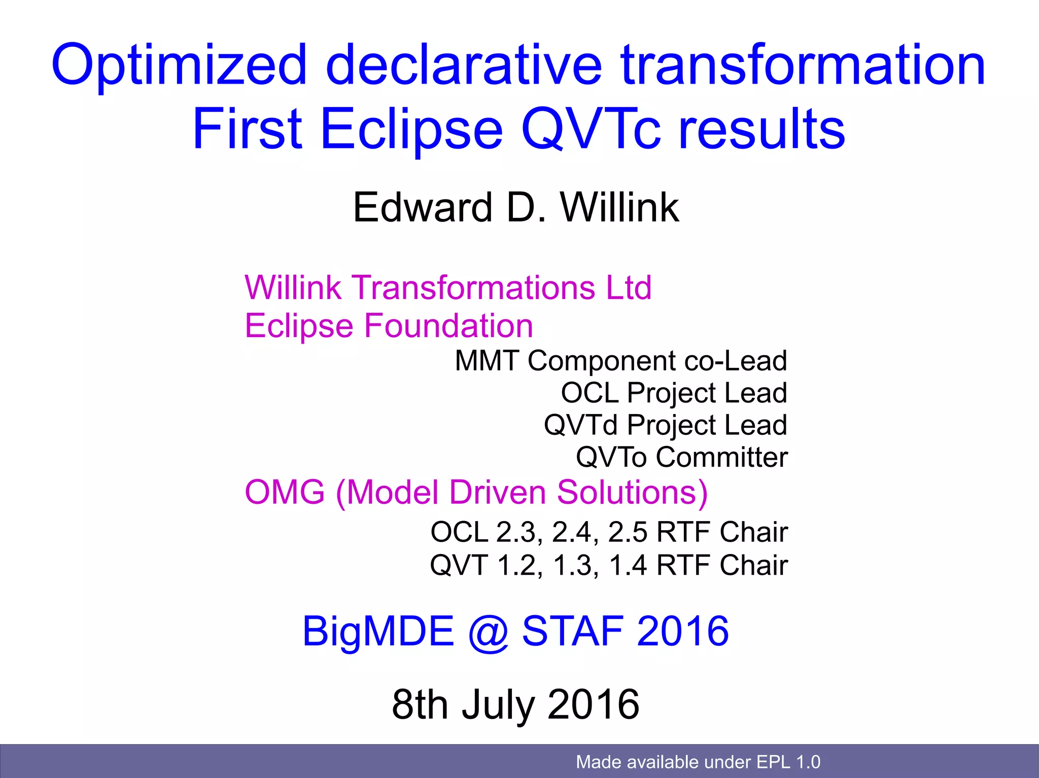 1) This document discusses the first results from Eclipse QVTc, which implements the declarative QVT Core (QVTc) specification for model transformations.