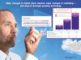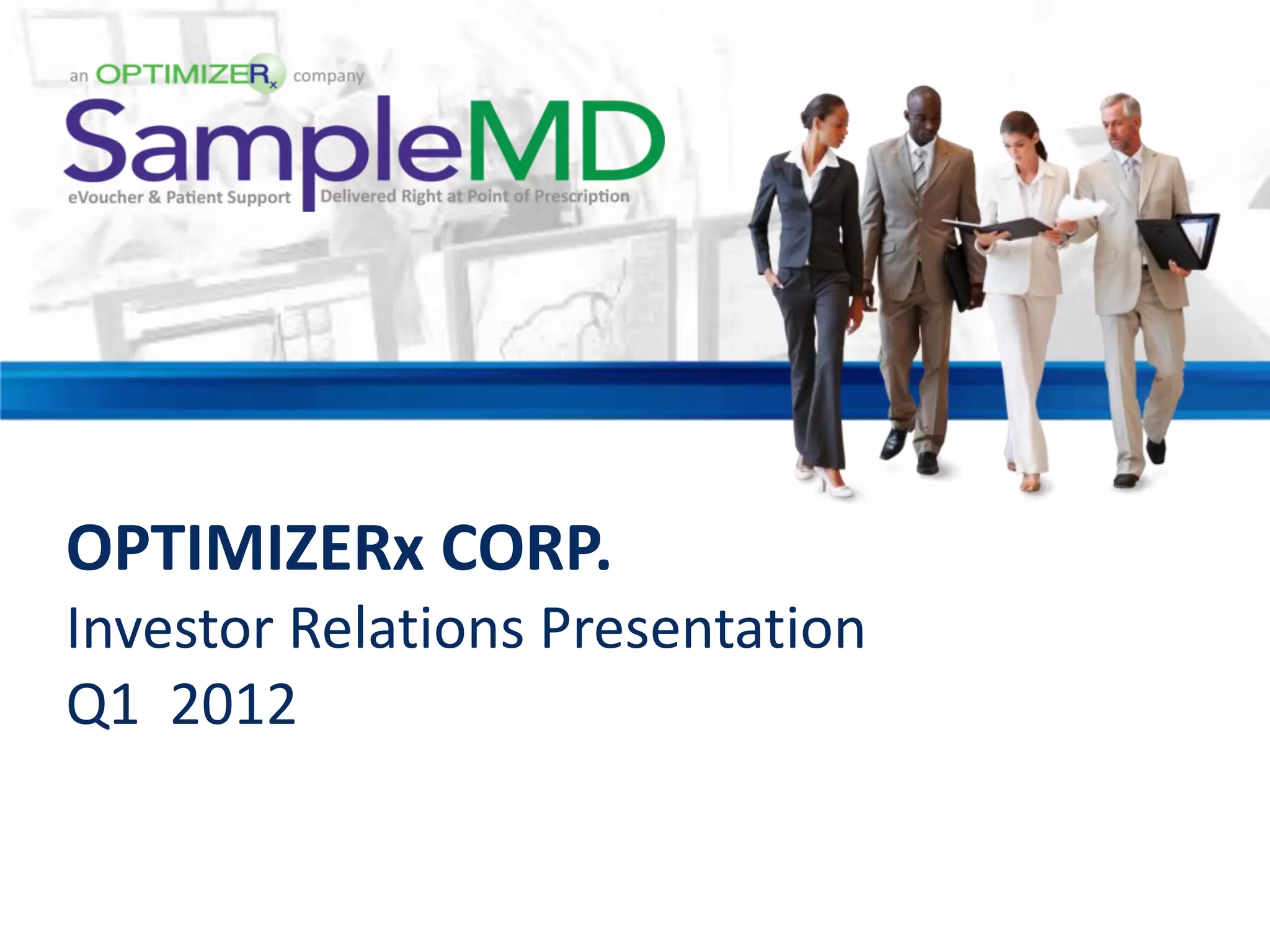 The document discusses Optimizerx's SampleMD software, which allows doctors to electronically send drug sample vouchers and coupons to patients directly from their EHR systems. This helps doctors assist more patients and drug companies market to doctors in a compliant way. SampleMD partners with large EHR vendors like Allscripts to reach over 200,000 doctors. It generates revenue by charging drug companies to offer samples/coupons and receiving fees for every one used. The business model is highly leveraged as growing adoption could enable high volumes of incremental revenue with modest overhead costs.