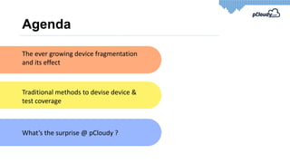 The document discusses strategies for optimizing device and test coverage in the context of increasing device fragmentation, particularly within the Android ecosystem. It outlines methods for selecting devices based on market penetration and diversity, while also highlighting the potential limitations of focusing solely on popular devices. Additionally, it provides insights into common issues that arise from device-specific factors and emphasizes the need for data-driven testing approaches.