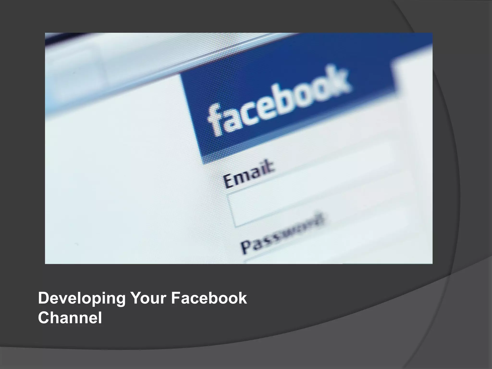 This document provides an overview of developing a Facebook channel and marketing strategy. It discusses what Facebook is, how people commonly use it, and provides an example of how RIM uses Facebook. It then outlines the key aspects of an effective Facebook marketing strategy, including engaging existing fans, driving action, adding scale, and measuring success. Various Facebook features are also explored, such as special offers, social plugins, mobile integration and location-based services. The document stresses the importance of measuring the results of any Facebook marketing campaign.
