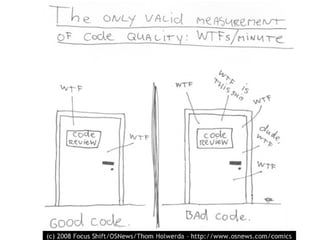 The document emphasizes the importance of writing readable code for better understanding and maintenance by humans, highlighting that good programming goes beyond machine interpretation. Key principles include keeping methods short, using meaningful names, and adhering to practices like the boy scout rule to promote a healthy code base. It advocates for techniques such as pair programming, code reviews, and balancing simplicity with clarity to ensure code remains comprehensible and enjoyable to work with.