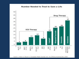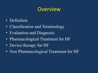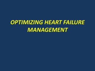 Cardiac resynchronization therapy (CRT) and implantable cardioverter defibrillators (ICDs) can help optimize heart failure management. CRT improves symptoms, reduces hospitalizations, and increases survival in patients with reduced ejection fraction, left bundle branch block, and wide QRS duration. ICDs prevent sudden cardiac death in high-risk patients with prior heart failure, low ejection fraction, or history of dangerous arrhythmias. New devices use adaptive and multi-point pacing to better resynchronize the left ventricle. Device therapy improves outcomes when guided by clinical evidence and used in appropriate heart failure patients.