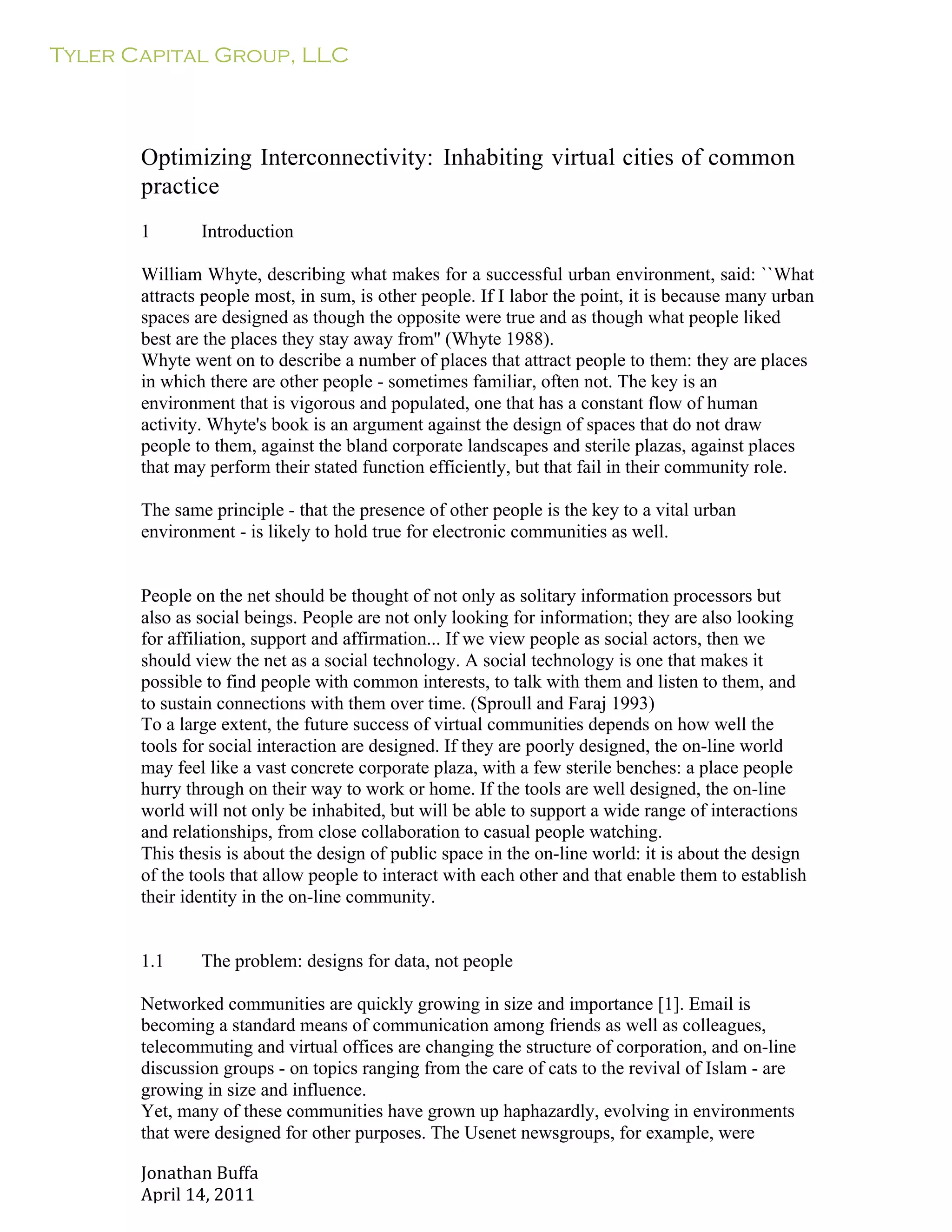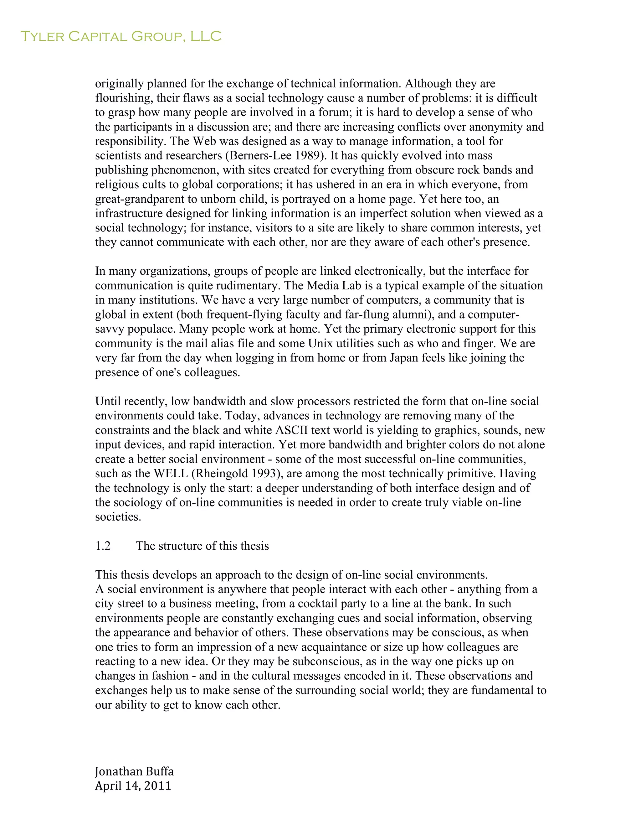This document discusses the design of online social environments and virtual communities. It argues that online spaces should be designed as social technologies that facilitate human interaction, rather than just as tools for sharing information. The author proposes using the city as a metaphor to think about designing virtual spaces, and discusses how identity formation works differently online compared to in-person due to the lack of physical cues. The document outlines the author's thesis, which develops approaches for creating online spaces that better support social interaction and the communication of identity through visualization tools and information architectures.