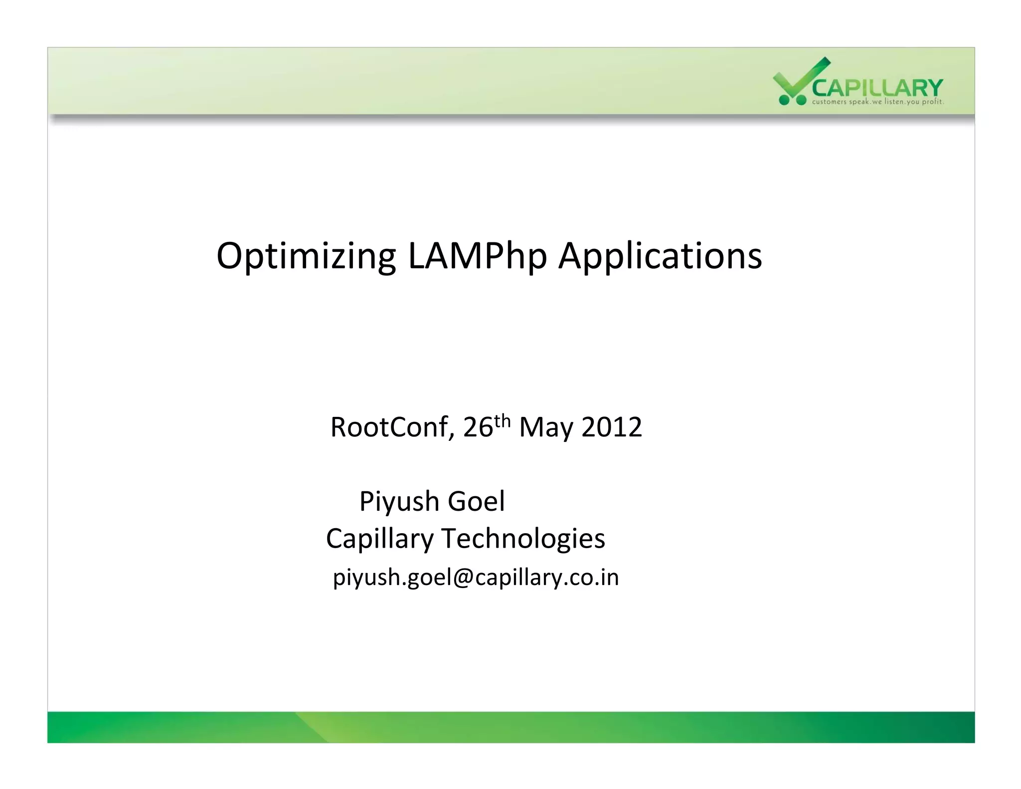 The document discusses optimization strategies for PHP applications and web services, emphasizing that there are no one-size-fits-all solutions, only guidelines and best practices. It covers various aspects, including Apache tuning, PHP opcode caching, MySQL optimization, and essential tools for profiling and monitoring performance. The speaker also encourages understanding underlying systems to improve overall efficiency.