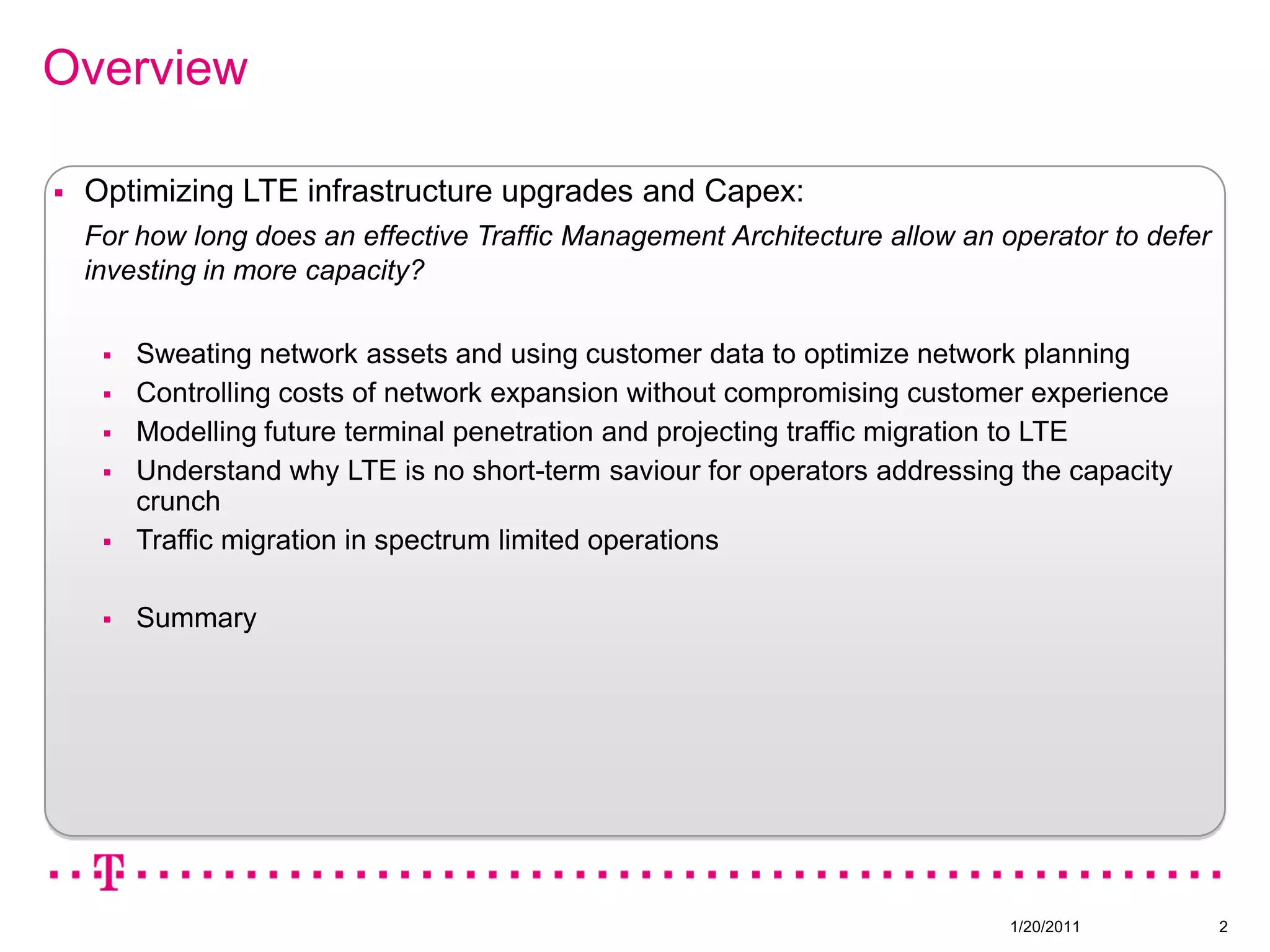 3) Controlling the costs of network expansion by utilizing traffic management measures to flatten 3G traffic peaks and delay necessary capacity upgrades, as traffic growth will only slowly migrate to LTE over several years.