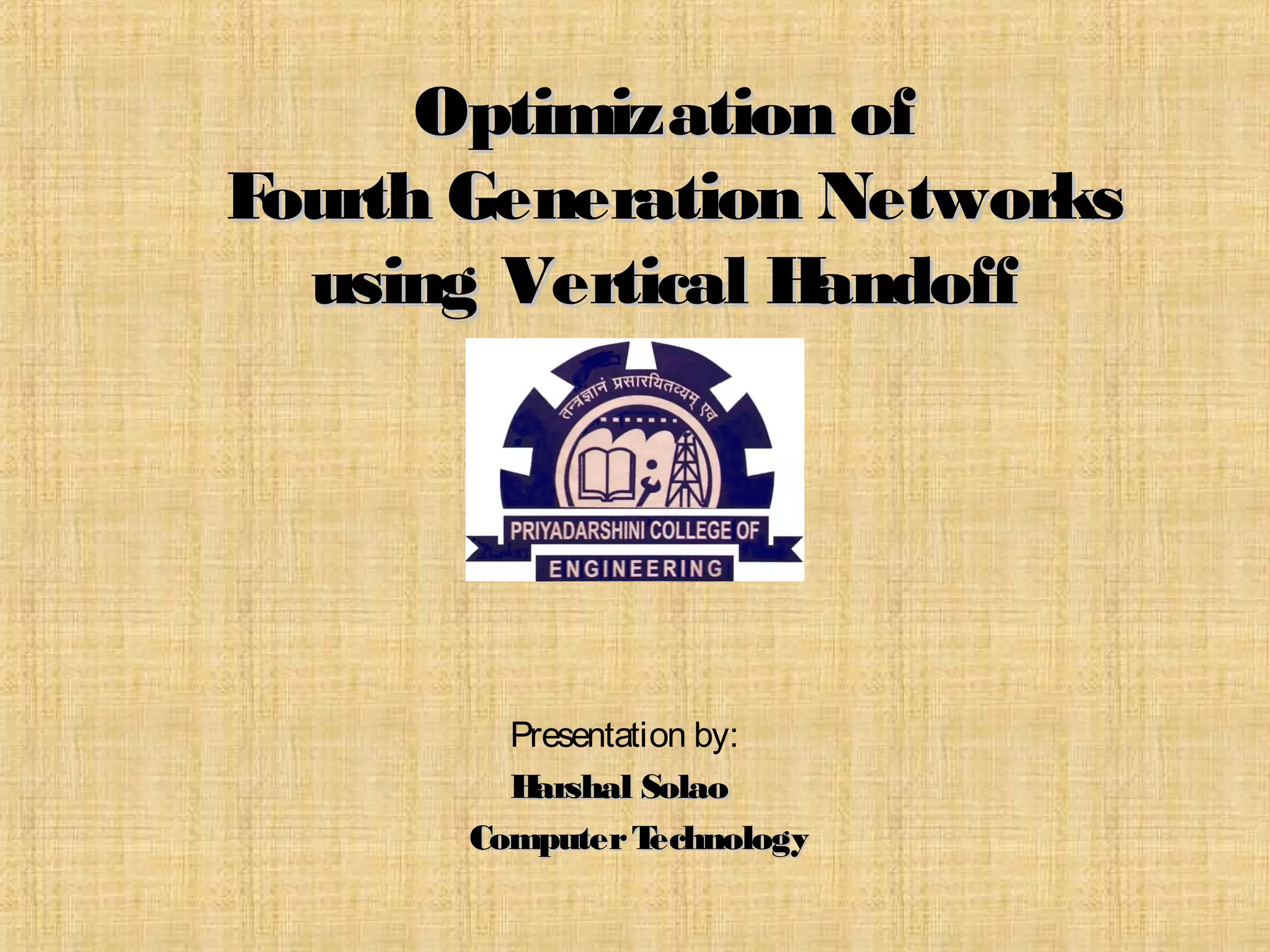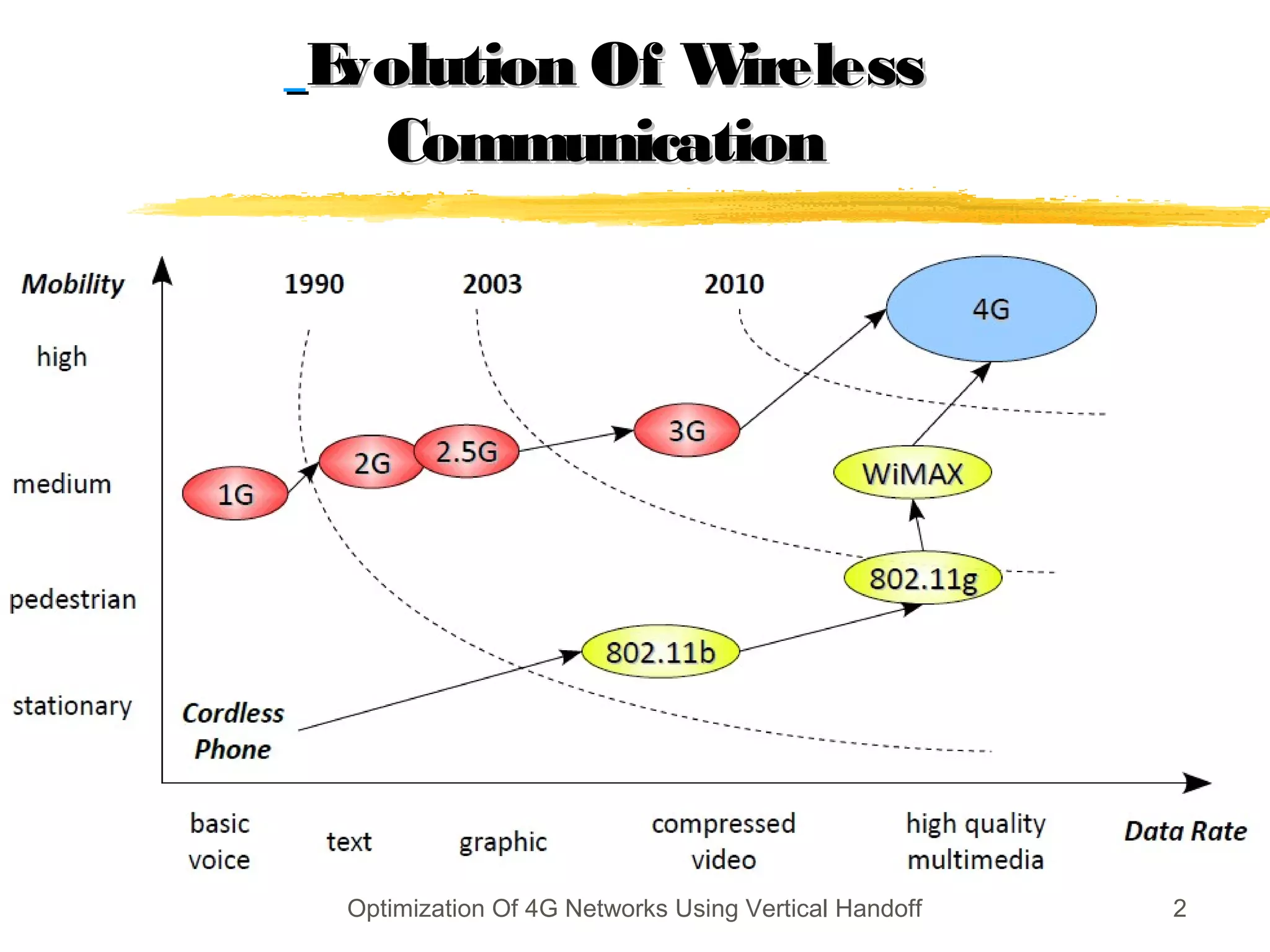 The document discusses the optimization of fourth generation (4G) networks through vertical handoff techniques, detailing the evolution of wireless communication from 1G to 4G. It highlights the handover process, which allows seamless transitions between different network technologies to enhance user experience and service quality while considering factors such as connectivity, mobility, and service costs. Additionally, it presents a model based on WLAN and WCDMA integration using SINR algorithms to minimize handover failures and improve data throughput.