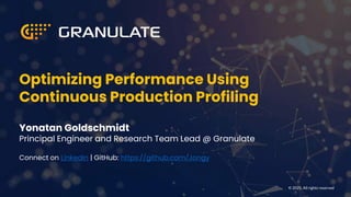 The document discusses performance optimization through continuous production profiling, highlighting the importance of reducing costs and improving service level agreements (SLA). It introduces various profiling types, particularly CPU profiling, which aids in optimizing application performance with low overhead. The author, Yonatan Goldschmidt, shares insights on utilizing gprofiler for ongoing performance analysis and implementation of code improvements.